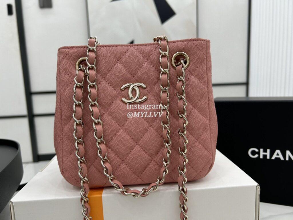 Top Quality Version:MYLLVV » Chanel Diamond Plaid Caviar Cowhide Bucket Bag Peach Red With Gold AS3176