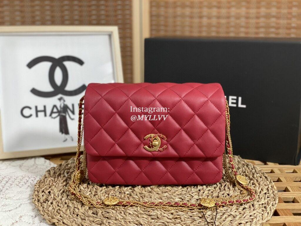 Top Quality Version:MYLLVV » Chanel Diamond Plaid Cowhide Gold Coin Chain Bag Red With Gold AP3378