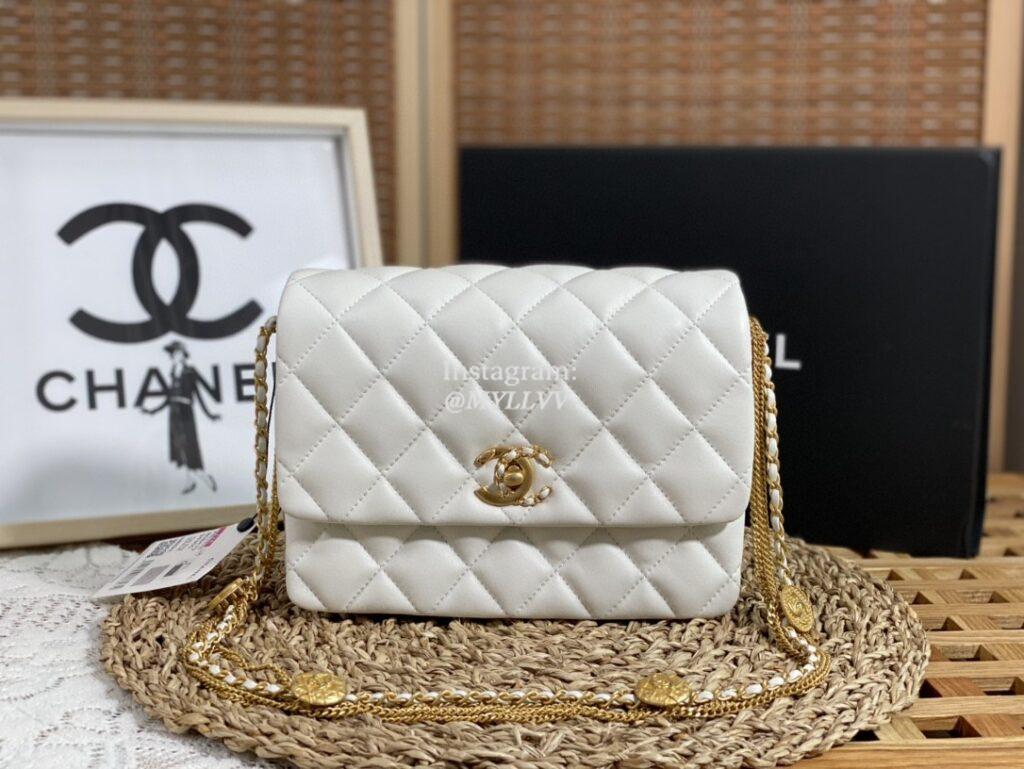 Top Quality Version:MYLLVV » Chanel Diamond Plaid Cowhide Gold Coin Chain Bag White With Gold AP3378