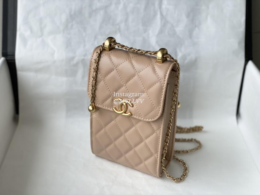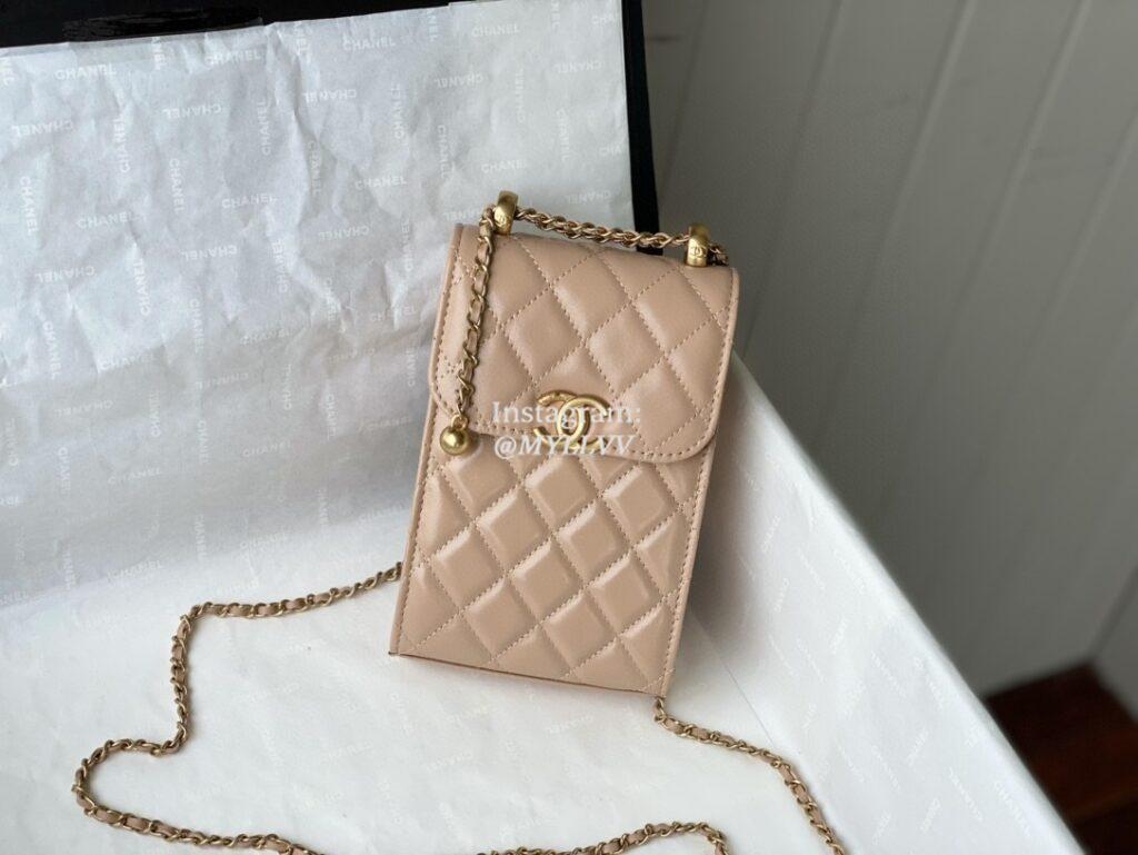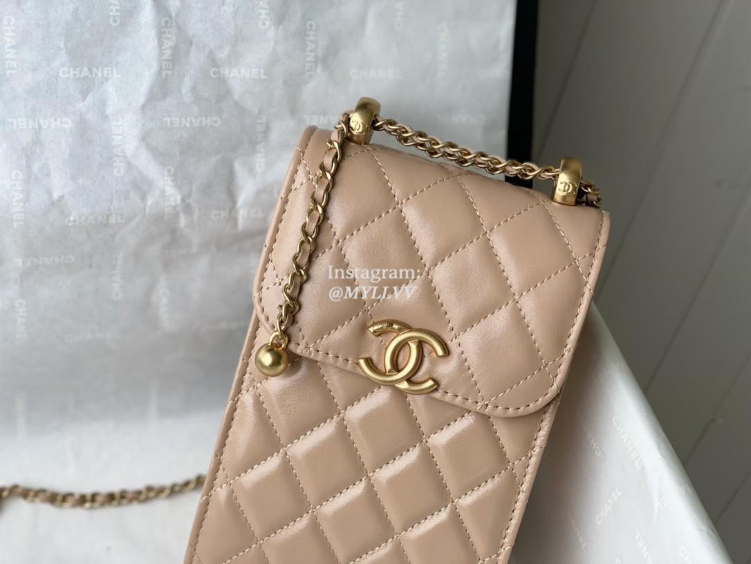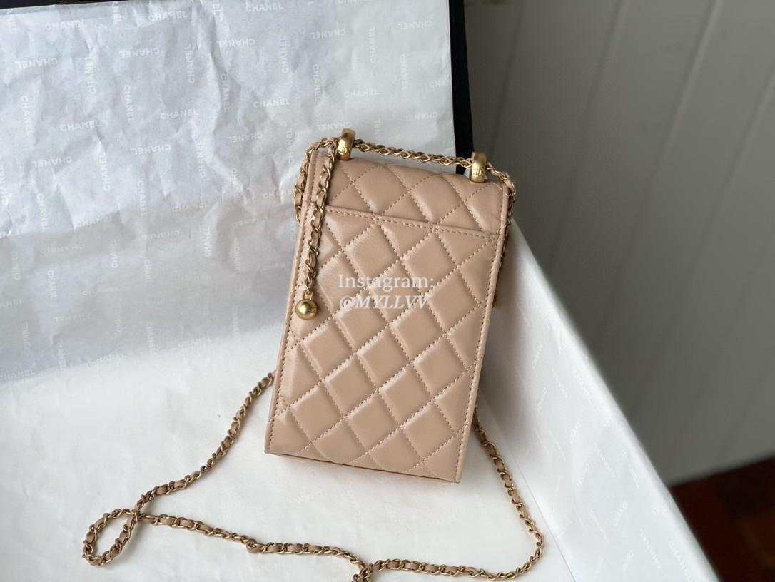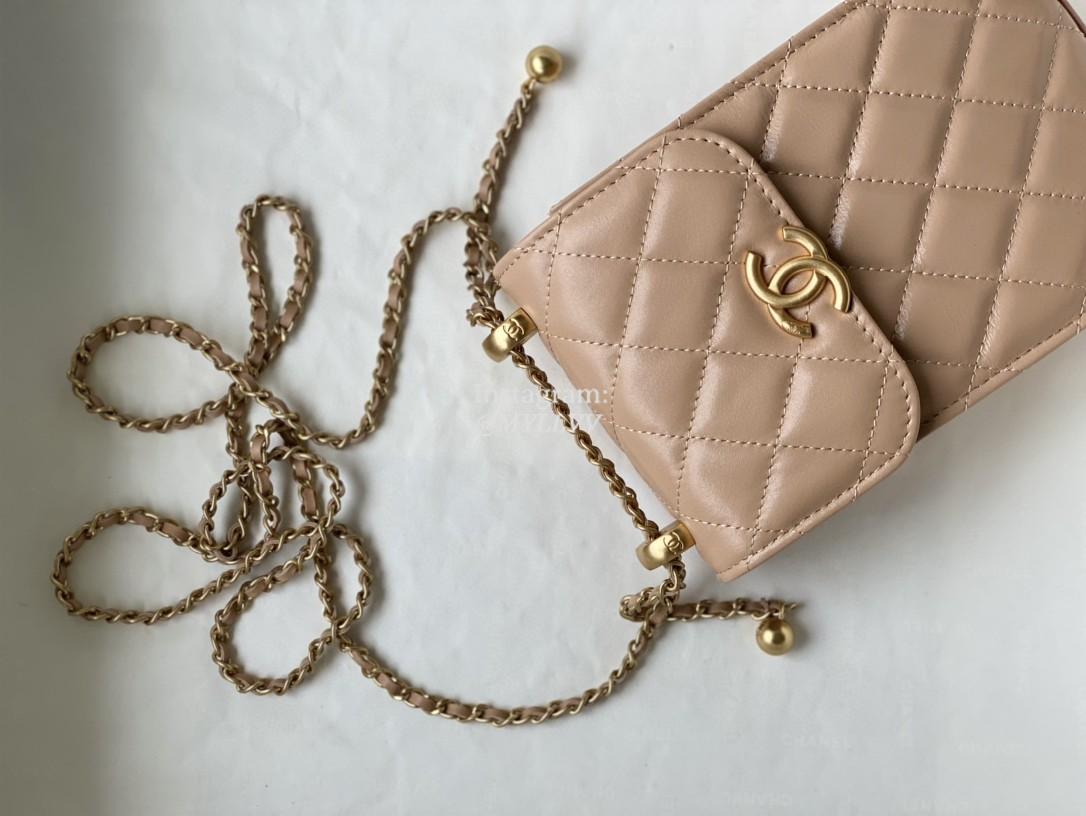 Top Quality Version:MYLLVV » Chanel Diamond Plaid Glossy Cowhide Phone Bag Apricot With Gold 81120