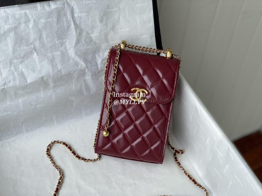Top Quality Version:MYLLVV » Chanel Diamond Plaid Glossy Cowhide Phone Bag Wine Red With Gold 81120