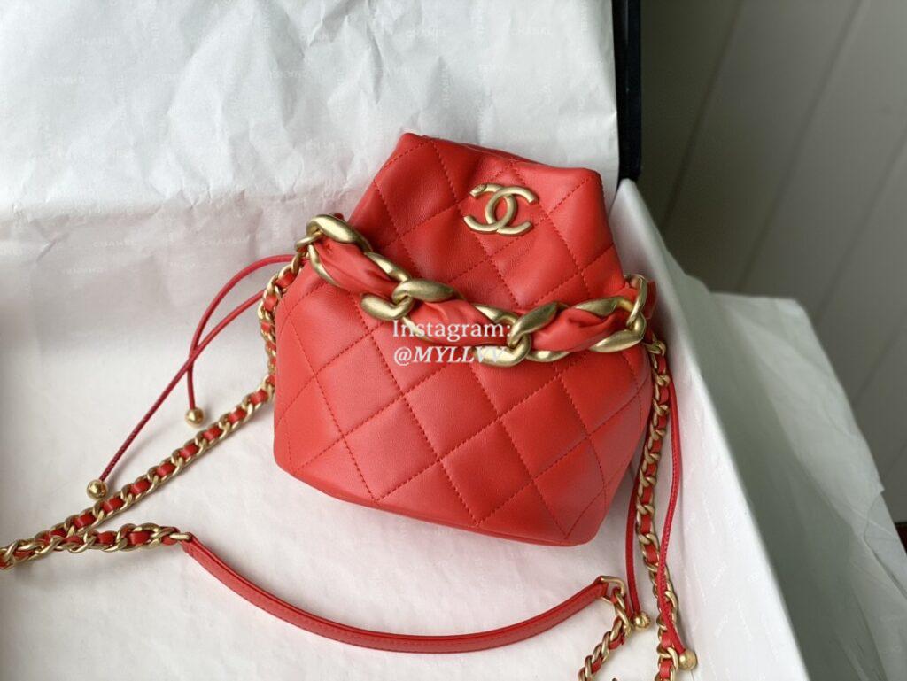 Dimension: 19.0 × 16.0 × 13.0 cm Top Quality Version:MYLLVV » Chanel Diamond Plaid Lambskin Bucket Bag Red With Gold AS2390