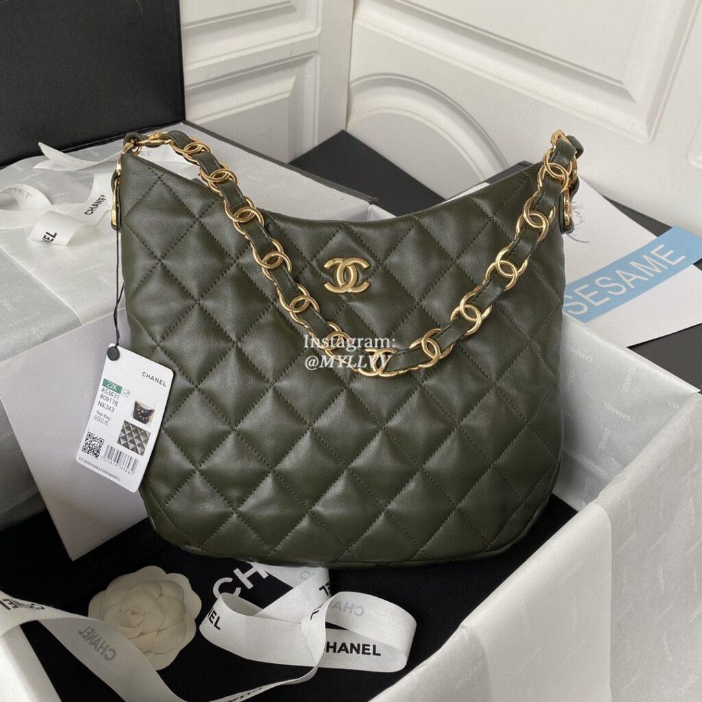 Top Quality Version:MYLLVV » Chanel Diamond Plaid Lambskin Hobo Shoulder Bag Dark Green With Gold AS3631