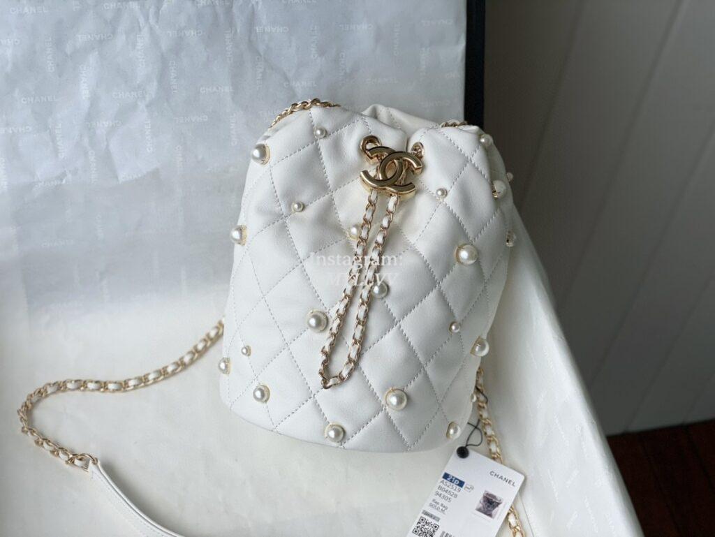 Top Quality Version:MYLLVV » Chanel Diamond Plaid Lambskin Mini Pearl Bucket Bag White With Gold AS2519