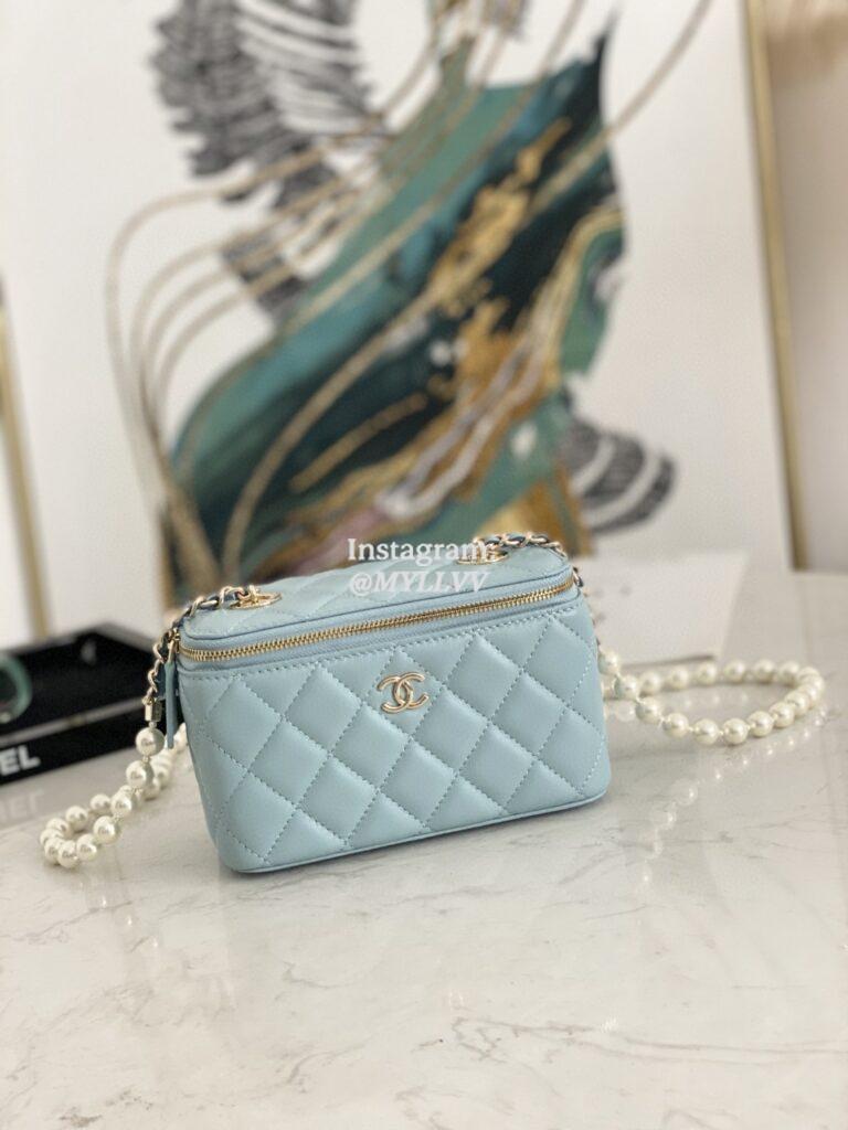 Top Quality Version:MYLLVV » Chanel Diamond Plaid Lambskin Pearl Chain Cosmetic Bag Sky Blue With Gold 81192