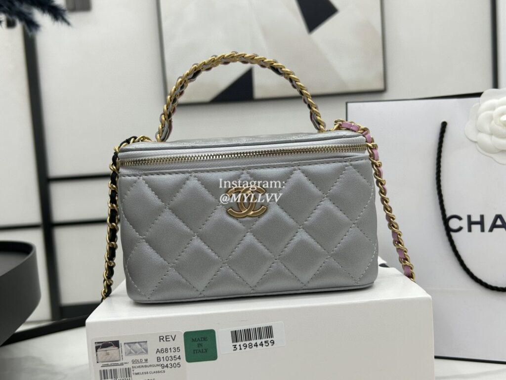 Top Quality Version:MYLLVV » Chanel Diamond Plaid Oil Wax Cowhide Handle Cosmetic Bag Grey With Gold A68135