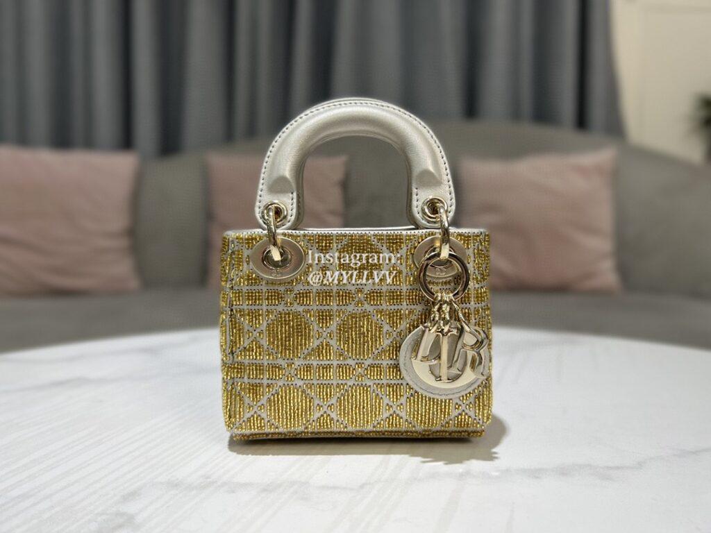 Top Quality Version:MYLLVV » Dior Gold Metallic Cannage Lambskin Embroidered With Beads Micro Lady Dior Bag S0856