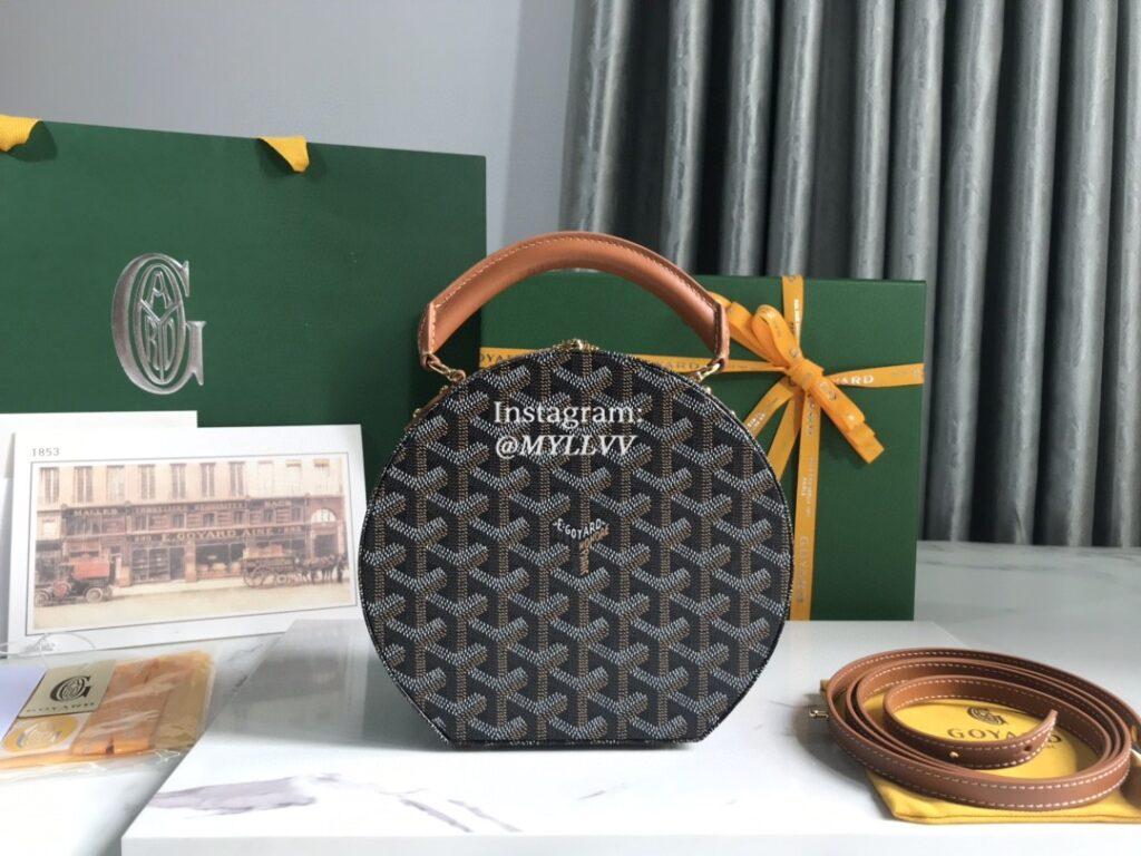 Top Quality Version:MYLLVV » Goyard Goyardine Canvas Chevroches Calfskin Cowhide Alto Round Box Bag Brown
