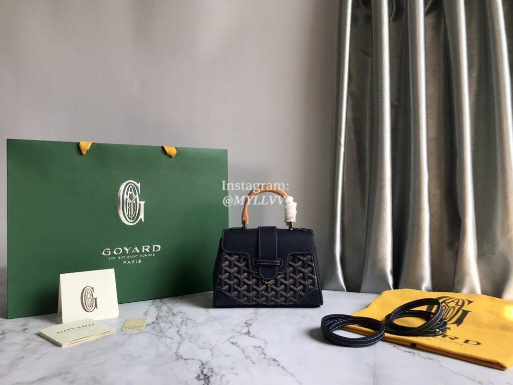 Top Quality Version:MYLLVV » Goyard Goyardine Canvas Chevroches Calfskin Cowhide Goyard Mini Saïgon Handle Bag Dark Blue