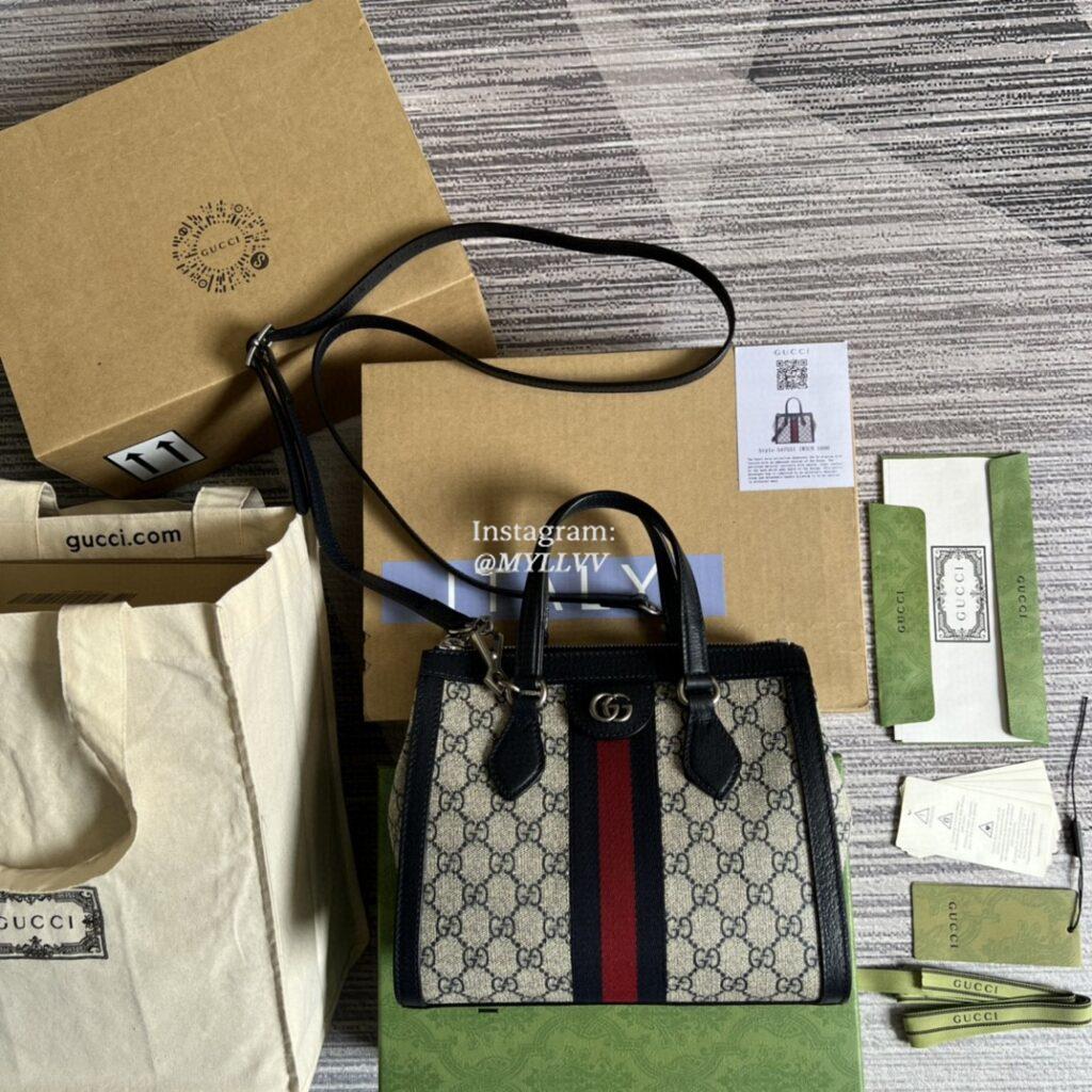 Top Quality Version:MYLLVV » Gucci Beige And Blue GG Supreme Canvas Ophidia Small GG Tote Bag 547551