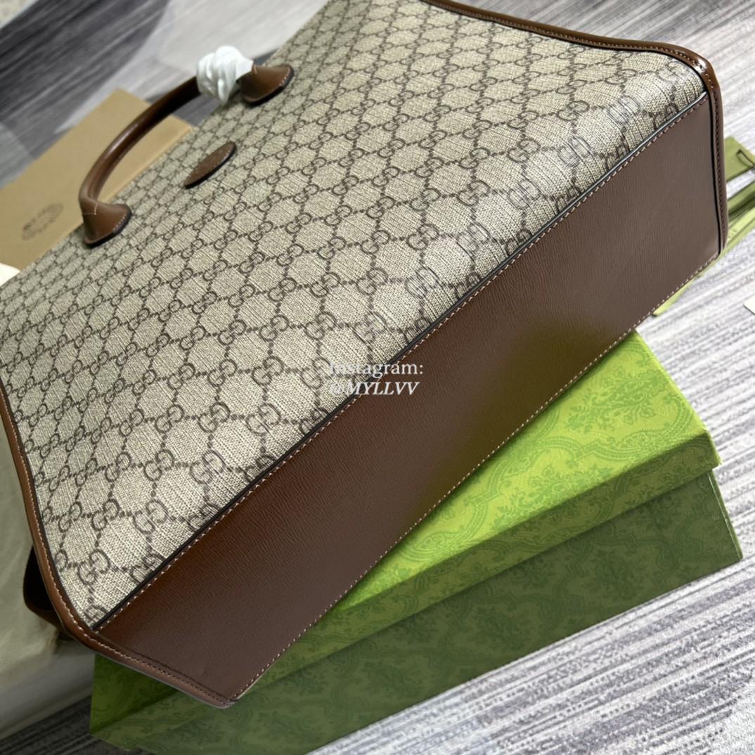 The Interlocking G has remained one of the most symbolic codes of the House since its introduction. The distinguishing emblem appears as a leather detail atop this tote bag. Completing the design’s logo feel, the style is crafted from beige and ebony monogram canvas.