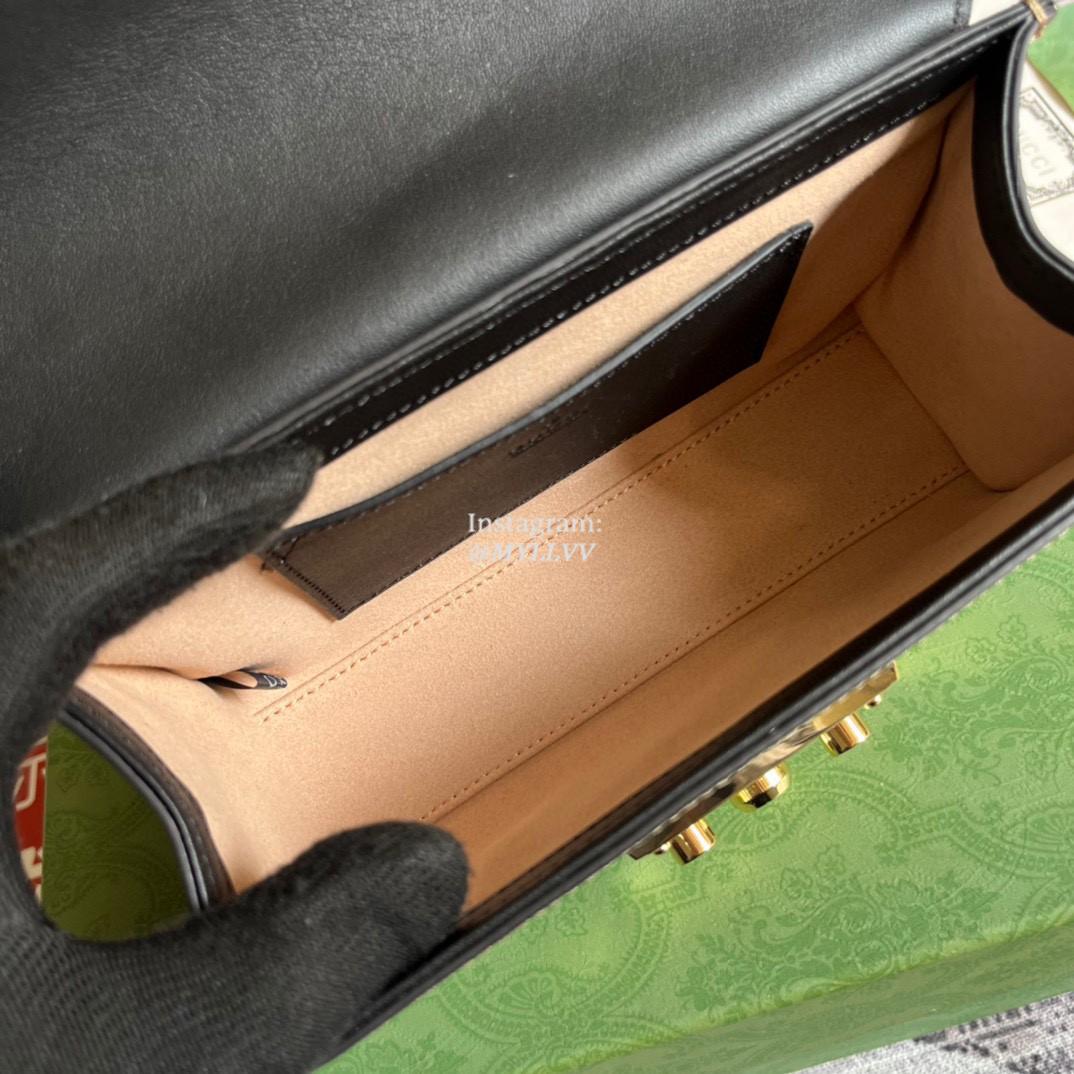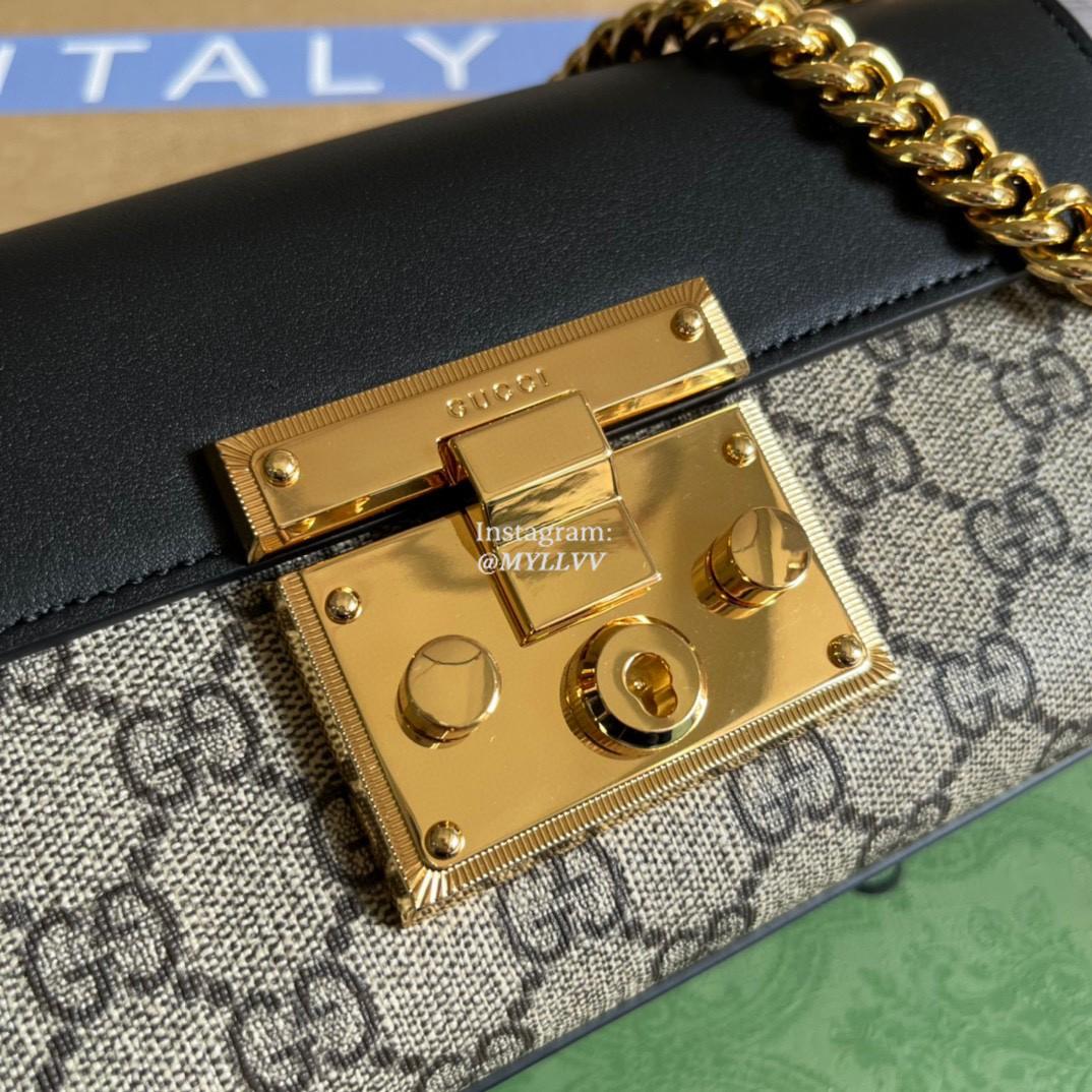The Padlock’s structured shape is presented in GG Supreme canvas with a black leather upper. Recalling the brand’s origins in the world of leisure and luggage, the small shoulder bag is defined by its padlock closure.