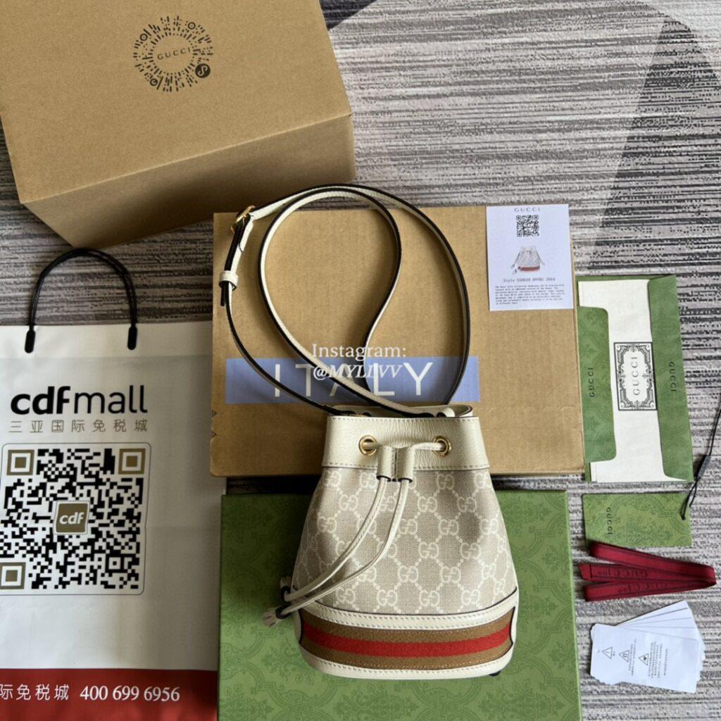 Top Quality Version:MYLLVV » Gucci Beige And White GG Supreme Canvas Ophidia Mini GG Bucket Bag 550620