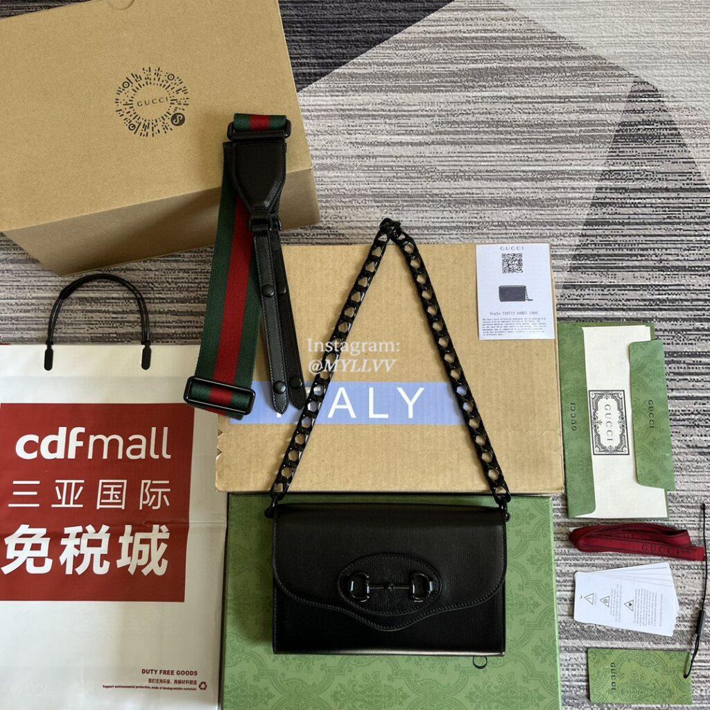 Embodying the notion of the versatility, the Gucci Horsebit 1955 is enriched with two detachable shoulder straps, one is crafted in emblematic green and red Web the other is in Gucci’s recognizable chain design. The style is crafted from black leather and defined by the line’s signature Horsebit hardware.