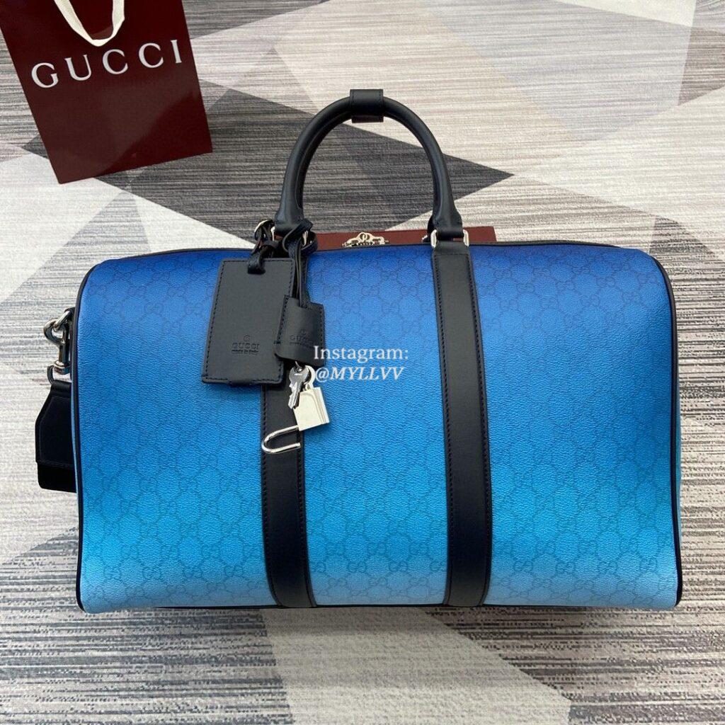The unique blue gradient effect print adds a fashionable aesthetic to this basic functional item. This travel bag is made of GG Monogram coated fabric and features a gradient GG print throughout, showcasing the design’s ingenuity.