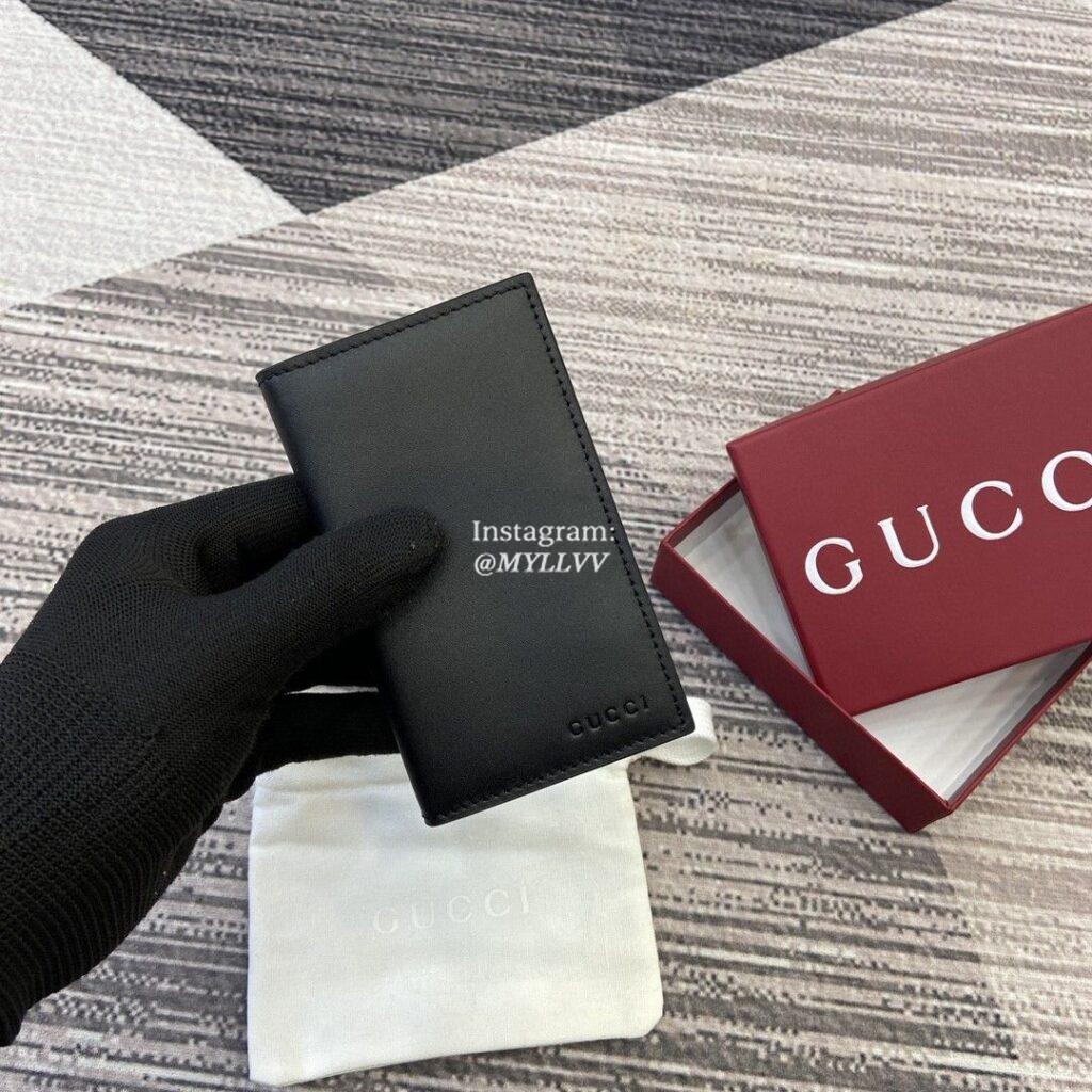 The GG Emblem series reinterprets classic patterns with creative design and innovative features, creating a collection that will be cherished for years to come. This double fold card holder is crafted with black glossy cowhide leather and cleverly incorporates a brand new GG letter interwoven pattern fabric inside, giving a fresh interpretation of the new accessory series. Carefully matched with Gucci embossing on the front, with multiple compartments inside.