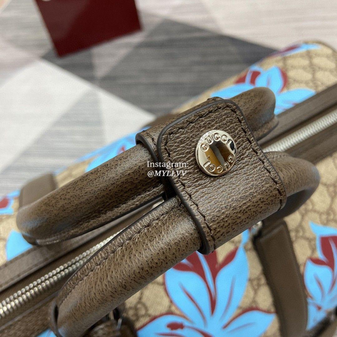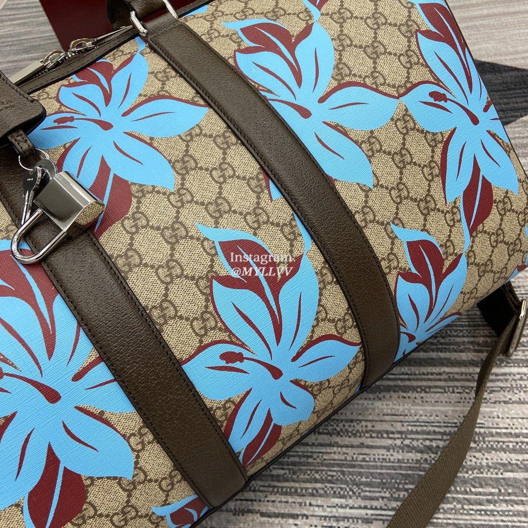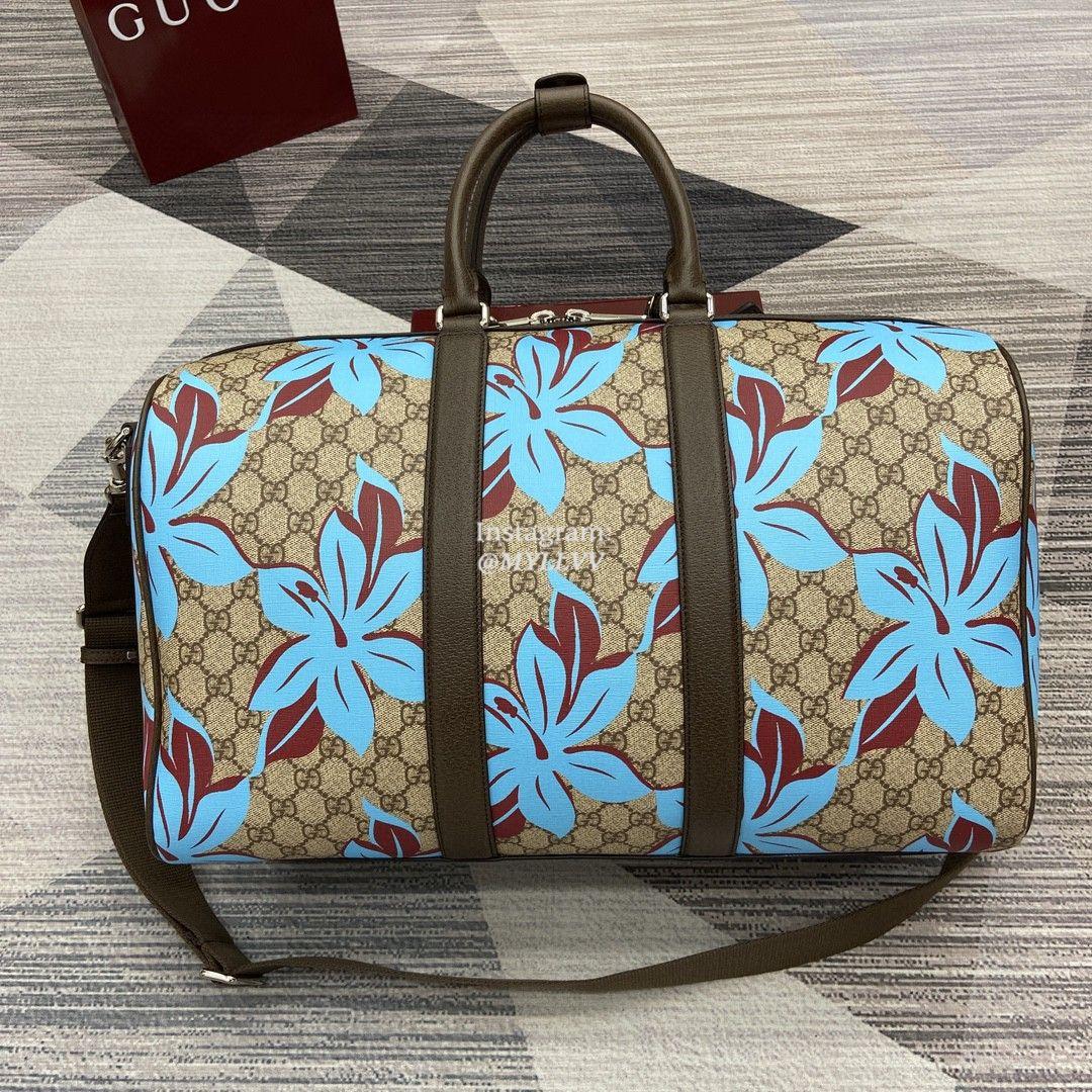 The iconic GG Supreme canvas made a stunning debut in the 2025 early autumn collection, with a fresh interpretation of floral prints in blue tones. This beige and dark brown travel bag is adorned with modern style flower patterns and GG logos.