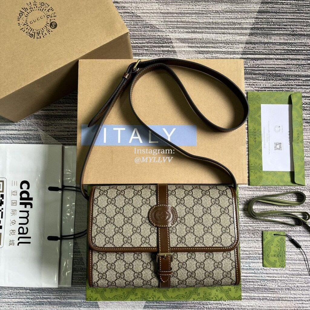 The GG pattern and interlocking double G logo details are cleverly blended, running through every item in the 2023 early autumn travel bag series. The new mailman bag combines a new silhouette with daily functions, fully showcasing Gucci’s modern vision and paying tribute to traditional aesthetics. This mailman bag is crafted with classic brown GG Supreme canvas and adorned with brown leather piping.
