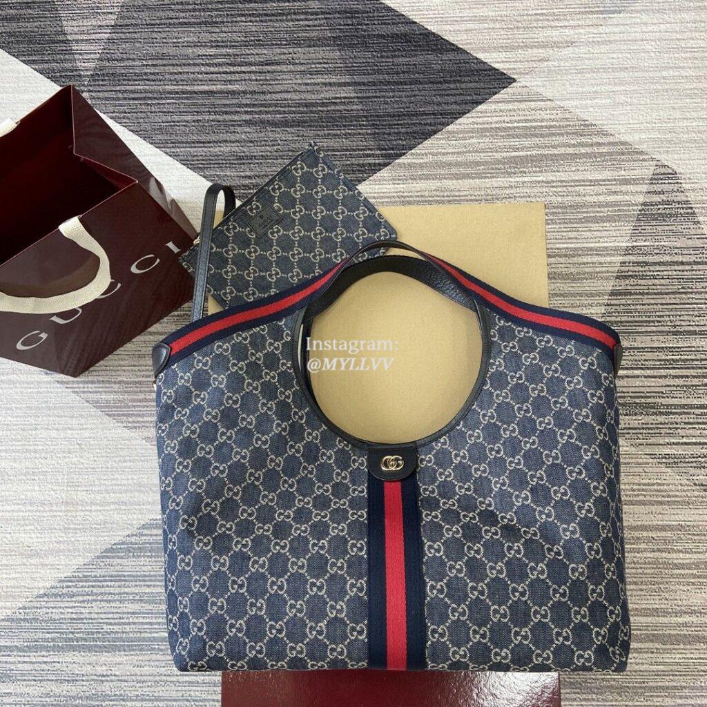 The ucci Giglio collection has made a new appearance at the 2026 early spring fashion show in Florence, paying tribute to the brand’s Italian roots and integrating timeless heritage and innovative spirit. This high-capacity tote bag is crafted with GG denim fabric, embellished with rolled webbing edges, and comes with a detachable clutch.