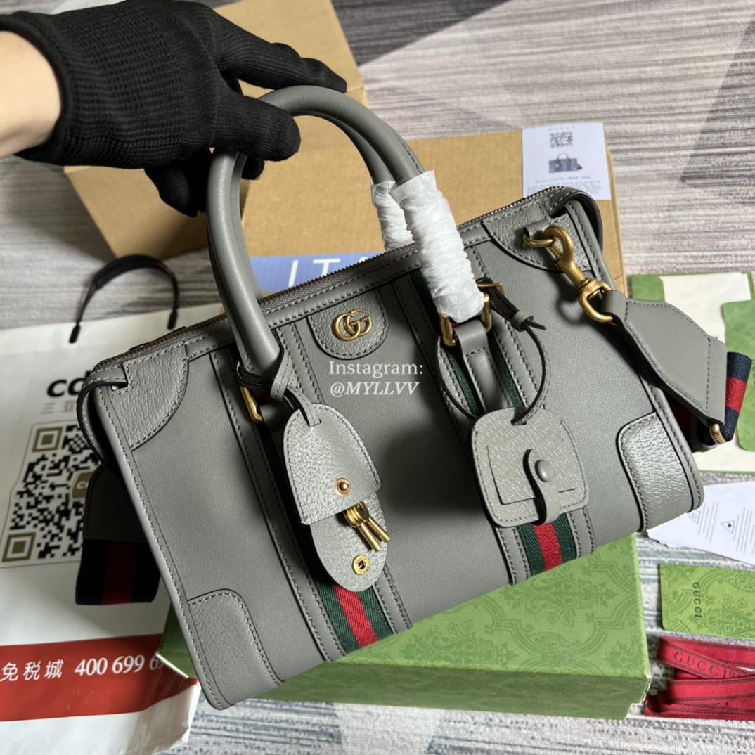 The top handle bag is reimagined in a new duffle style, part of the House’s latest collection Exquisite Gucci. Crafted in grey smooth leather, the Web stripe and Double G hardware characterize the silhouette with archival symbols of the House.