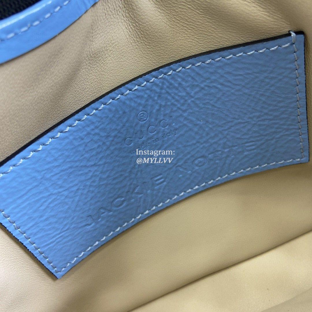 Interior: One open pocket adorned with Gucci logo and handwritten Jackie Notte lettering
