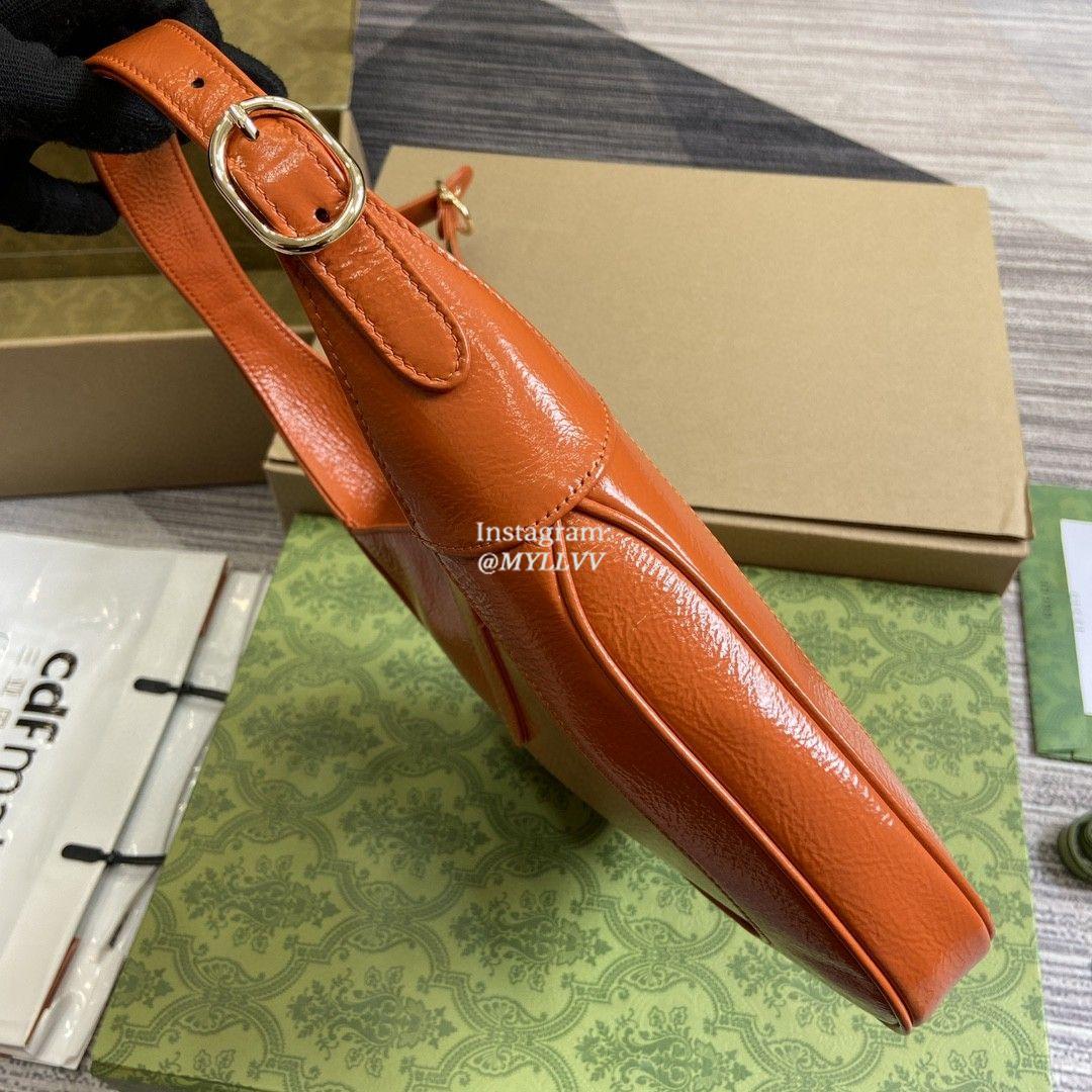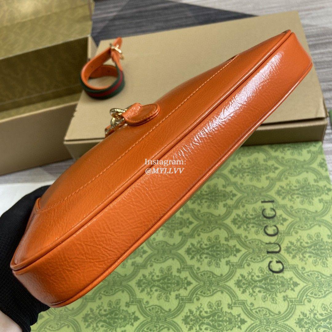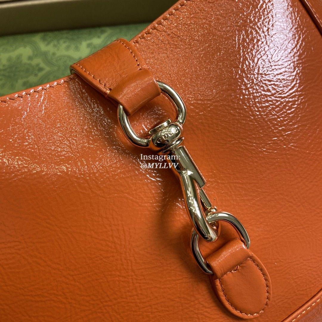 As part of the Gucci Lido collection, this item draws inspiration from the summer charm of the Italian coast and beach clubs. This Gucci Jackie series handbag is crafted with patent leather craftsmanship, showcasing the exquisite craftsmanship, crescent shape, and fashionable design of the brand’s classic shoulder bag. The light gold adjustable hook buckle and the included red and green woven strap strap work together to bring more dressing possibilities to this orange medium-sized shoulder bag.