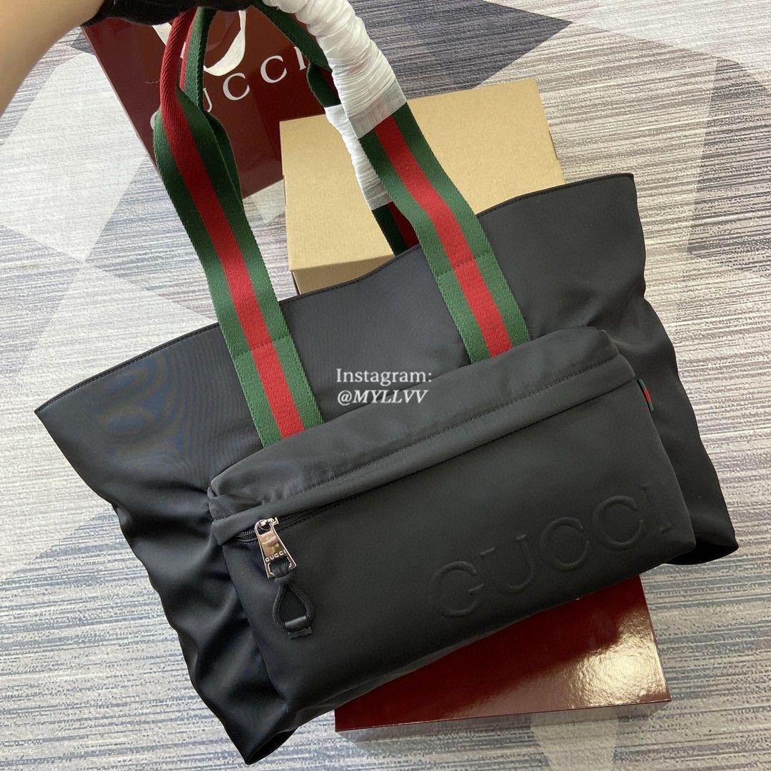 Multiple tote bags will make a dazzling appearance at the 2024 autumn/winter men’s fashion show, blending fashion lines and sporty style with ingenuity. This large backpack is made of soft and durable black nylon material, intricately embellished with Gucci embossed logos created using high-frequency embossing technology. It is understated and understated, showcasing exquisite craftsmanship. Other classic details include red and green ribbon handles and front ribbon details.