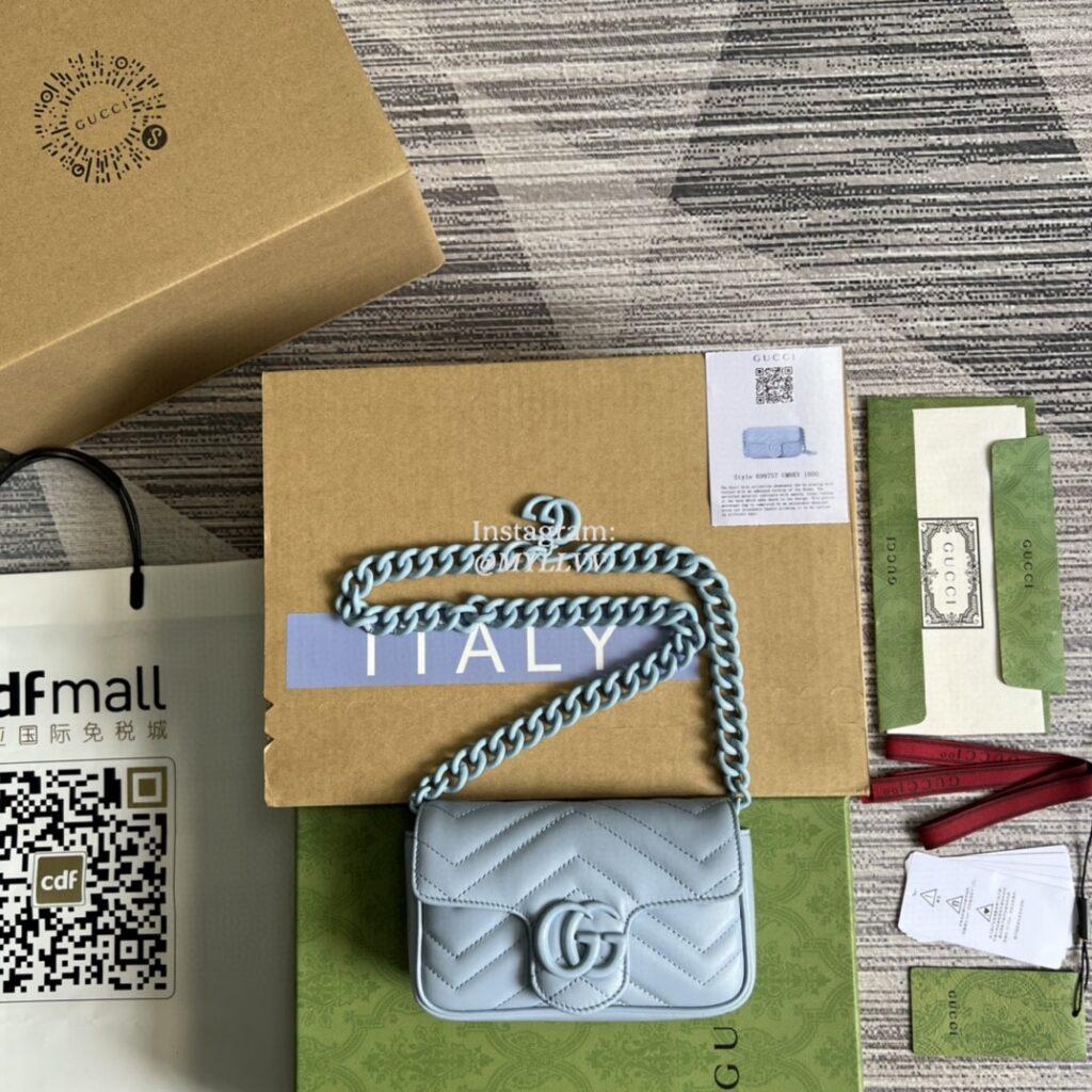 Top Quality Version:MYLLVV » Gucci Light Blue Chevron Matelassé Leather GG Marmont Belt Bag 699757