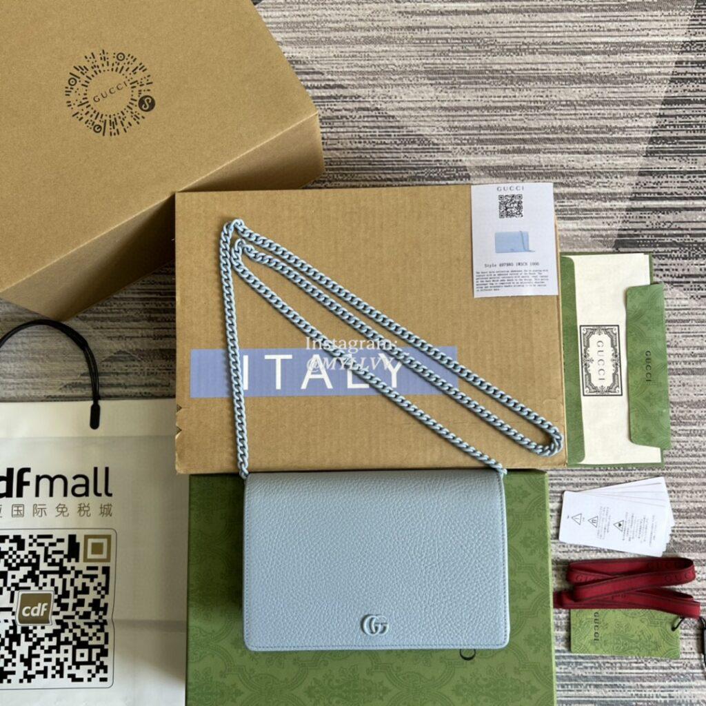 Top Quality Version:MYLLVV » Gucci Light Blue Leather GG Marmont Leather Mini Chain Bag 497985