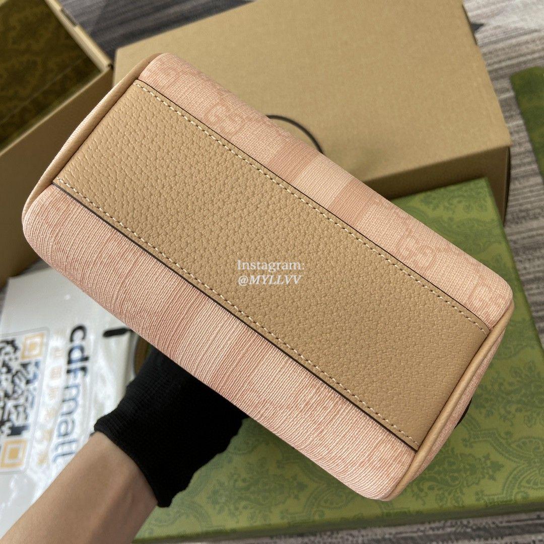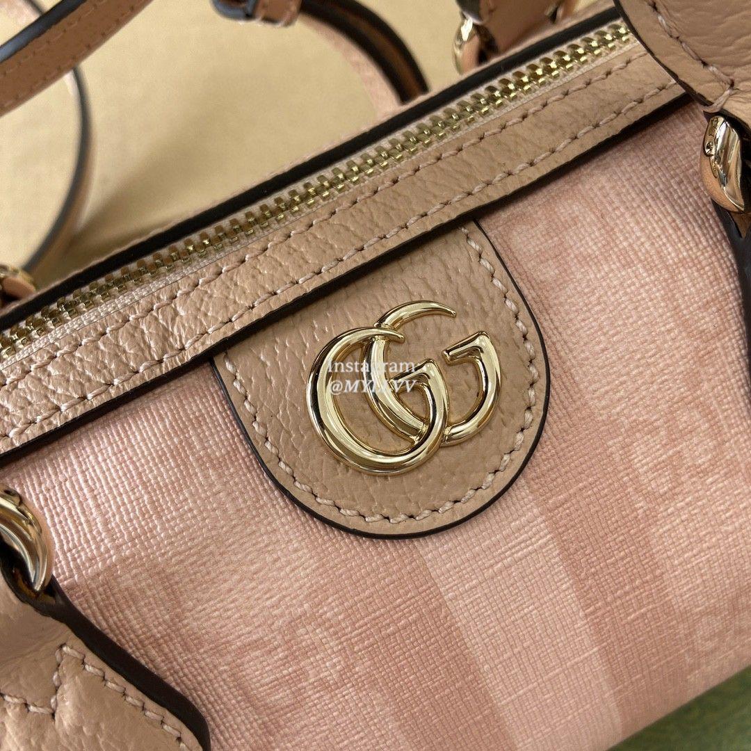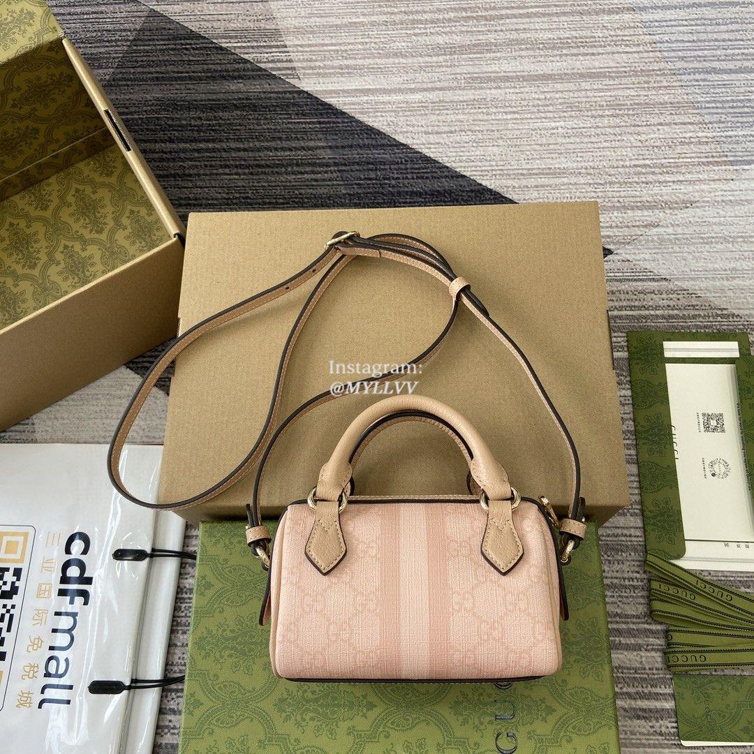 This Boston mini handbag adds a dazzling new addition to the Ophidia collection. This item is crafted with exquisite gray pink GG Supreme canvas, cleverly incorporating double-G accessories and striped webbing. Paired with detachable shoulder straps, the entire design adds even more charm.