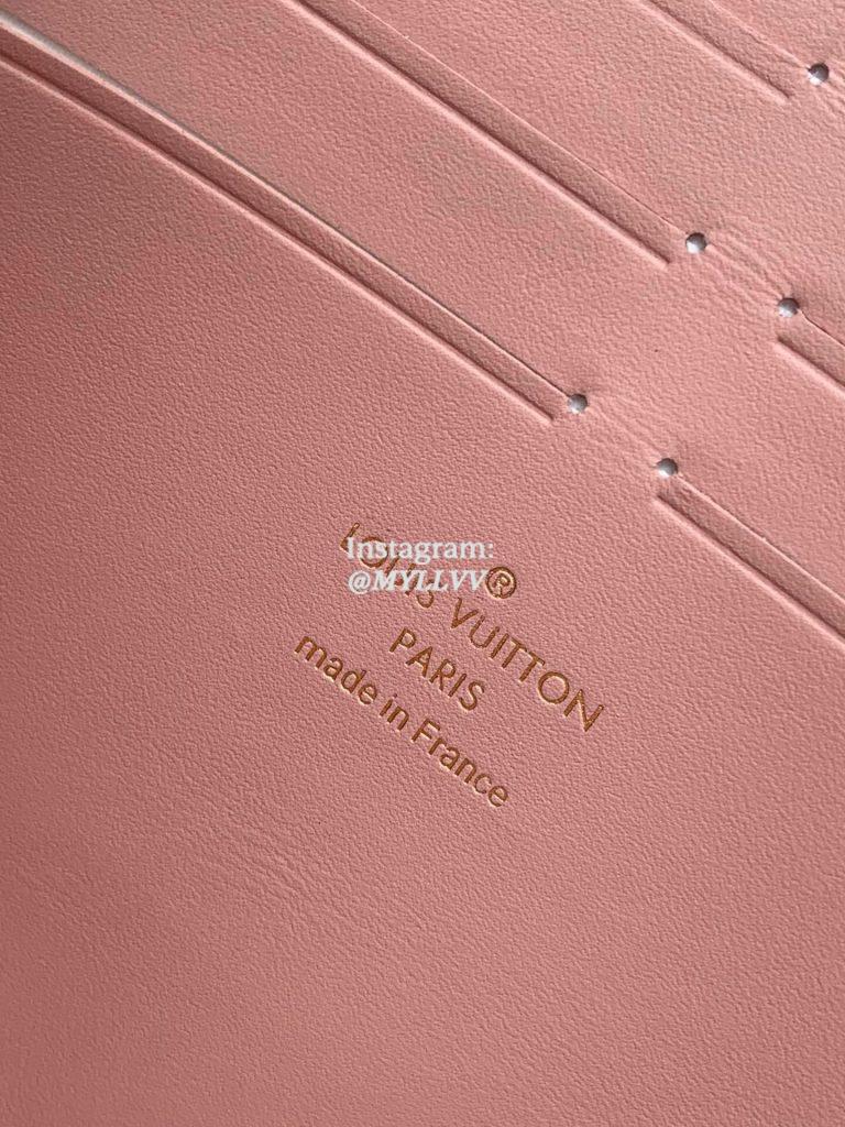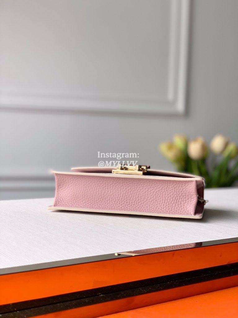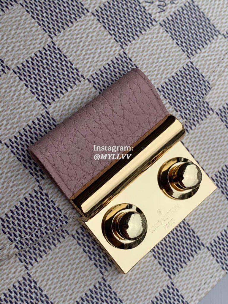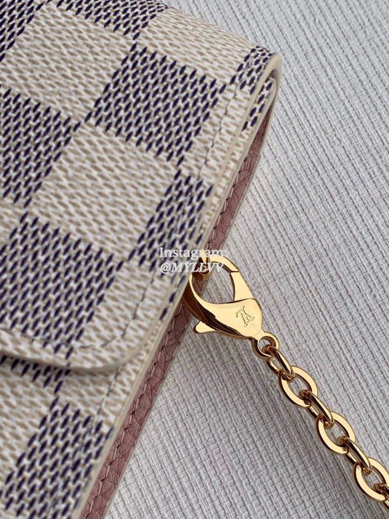 N60357 pink CROISETTE chain wallet Croisette chain wallet uses Damier Azur canvas and leather trim to outline neat configuration, with delicate details such as S-lock hook and detachable chain from Louis Vuitton classic hard case. It is suitable for hand, shoulder or crossbody. Size:21×13.5x5cm.