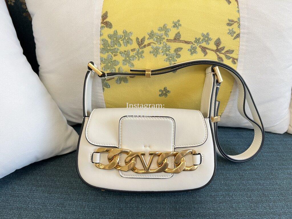 Fashioned from supple grained calf leather, the Lockme Tender cross-body bag comes with a wide removable and adjustable strap in addition to its traditional gold-color chain. Each side of this versatile strap has a different color and texture. A metallic D-ring on the strap means it can be personalized with a charm.