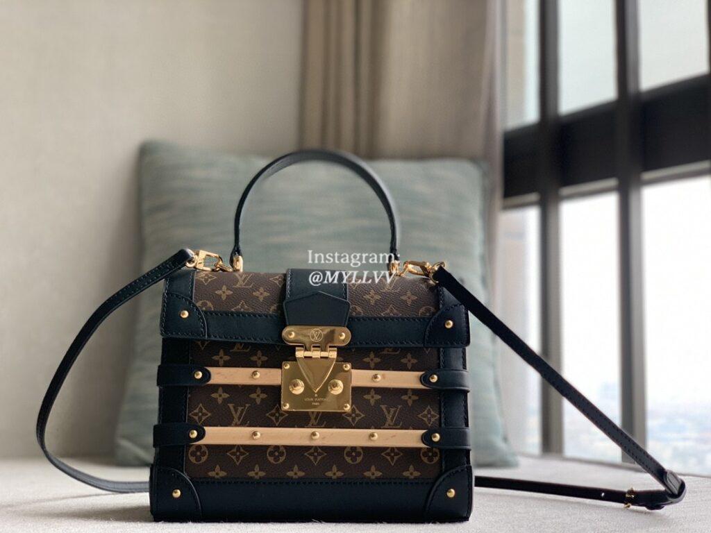 Nicolas Ghesquière looks back at Louis Vuitton’s box-making history with the small Trianon bag. Monogram canvas shapes the semi-rigid design, S-lock hook closure, leather and wood trim continue the traditional hard case elements, and the top handle and detachable and adjustable leather shoulder strap allow for shoulder and cross-body options.