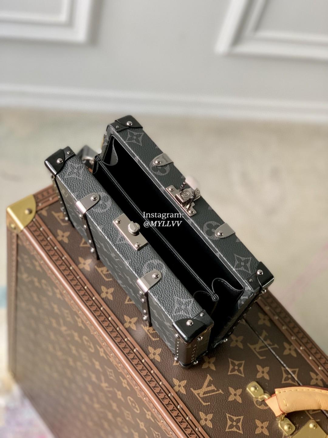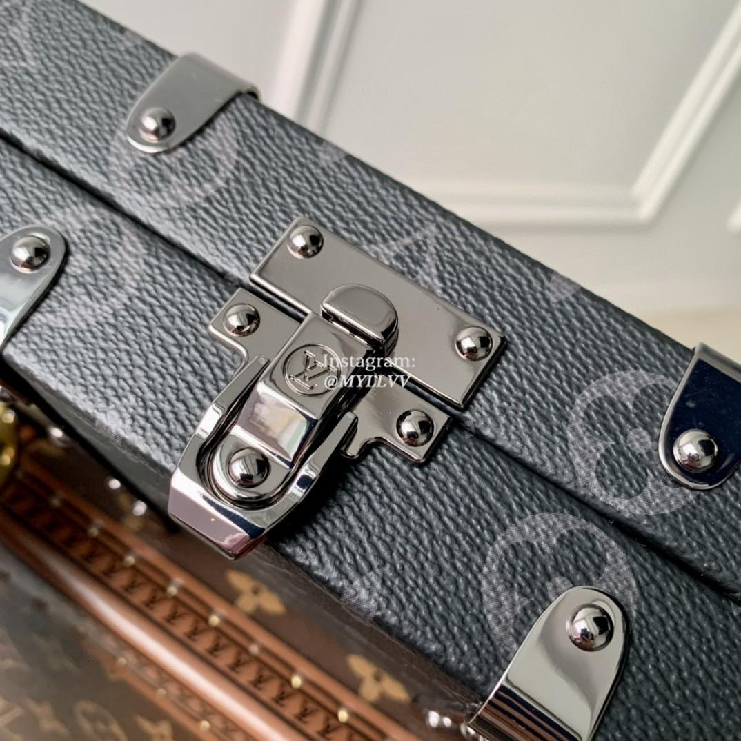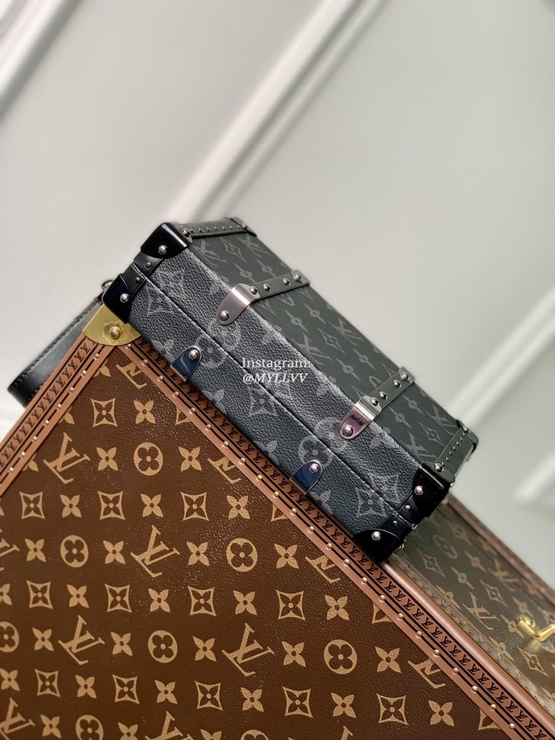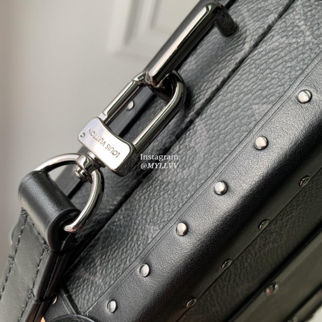Monogram Eclipse canvas brings a masculine feel to Virgil Abloh’s Wallet Trunk, a men’s hard-sided clutch wallet that evokes the trunks manufactured by the House in its early days. Its unique design includes reinforced metal corners, wooden side slats, and Ruthenium-color rivets. The well-designed interior and removable wrist strap make it ideal for everyday use.