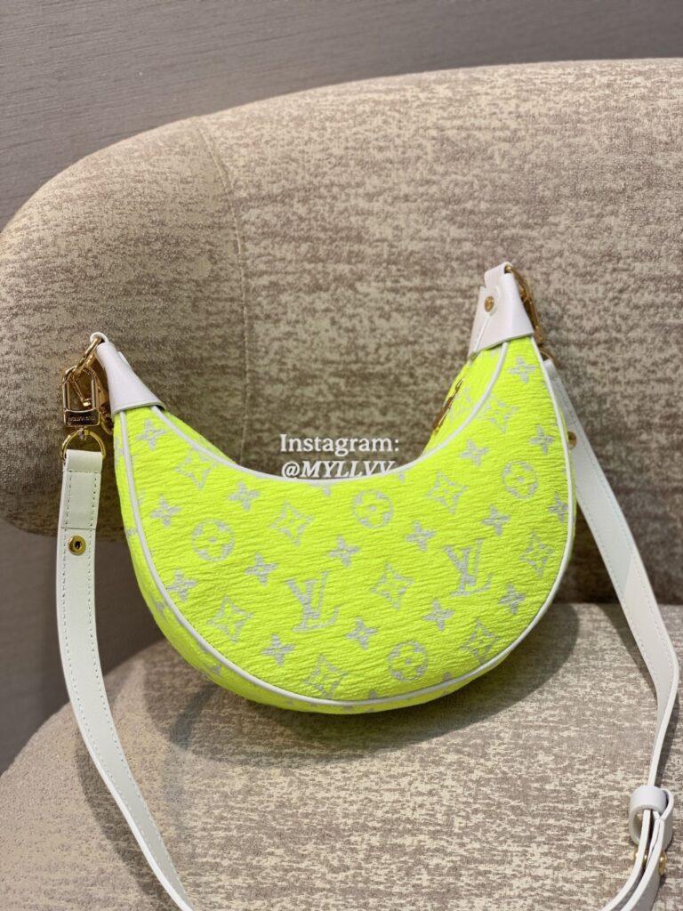The Loop half-moon baguette bag is fashioned from Monogram jacquard velvet in a bright yellow color, reminiscent of the iconic yellow of tennis balls. The jacquard velour is a 100% sustainable material made from recycled yarn.