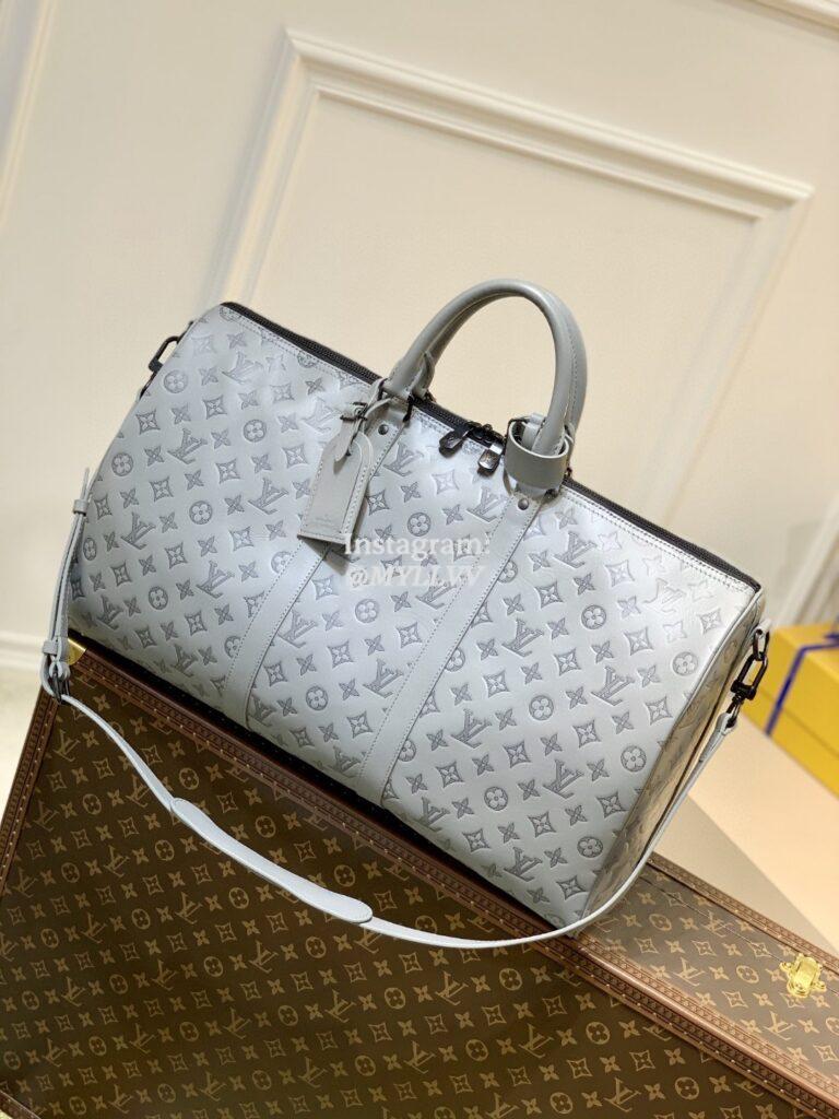 Louis Vuitton’s classic Keepall gets a contemporary new look with Monogram Shadow leather in a sophisticated shade of gray. Soft, supple calf leather is embossed with the House’s historic Monogram pattern for a refined signature touch. A large-capacity bag, perfect for short trips or as a carry-on.