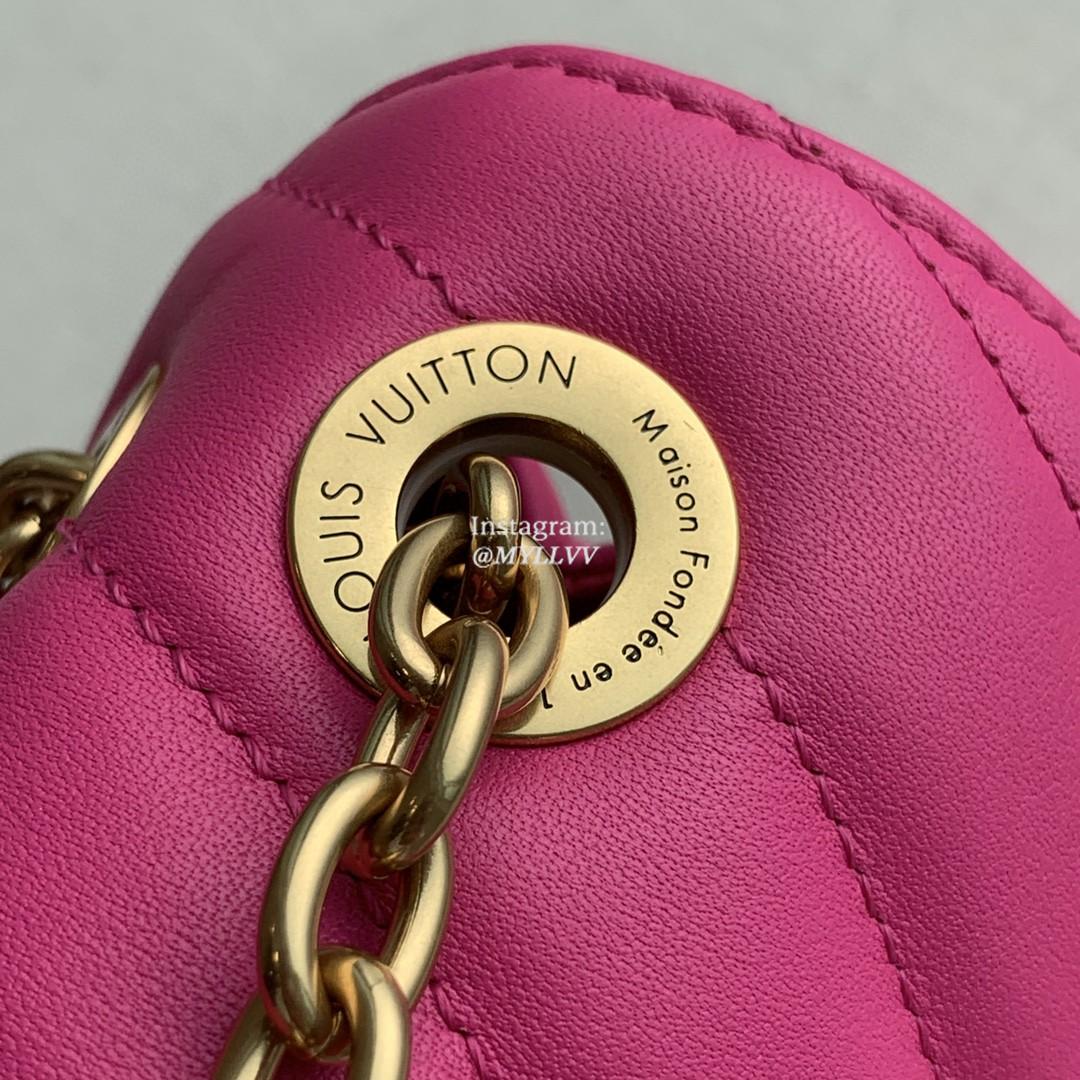 The signature V shaped quilting of this Chain Bag handbag is revisited in smooth cowhide leather. The vintage gold-color chain slides through engraved eyelets while the folded gussets make it supple and body-friendly. The interior enables easy organization of a woman’s essentials thanks to its multiple compartments. The recognizable LV emblem signs the bag.