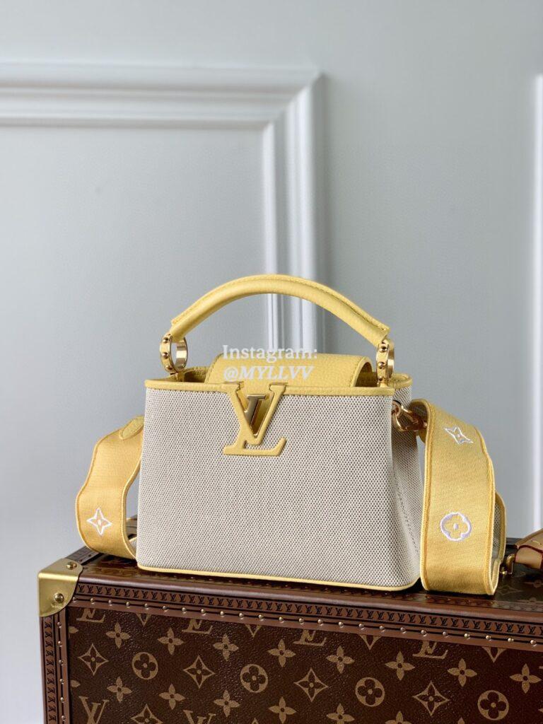 This summery edition of the Capucines BB handbag is crafted from natural ecru canvas with a top handle and trim in pastel-yellow Taurillon leather. The bag’s finely worked detachable strap, ideal for shoulder or cross-body wear, is embroidered with the address of the Louis Vuitton’s first Paris store at 4, rue des Capucine.