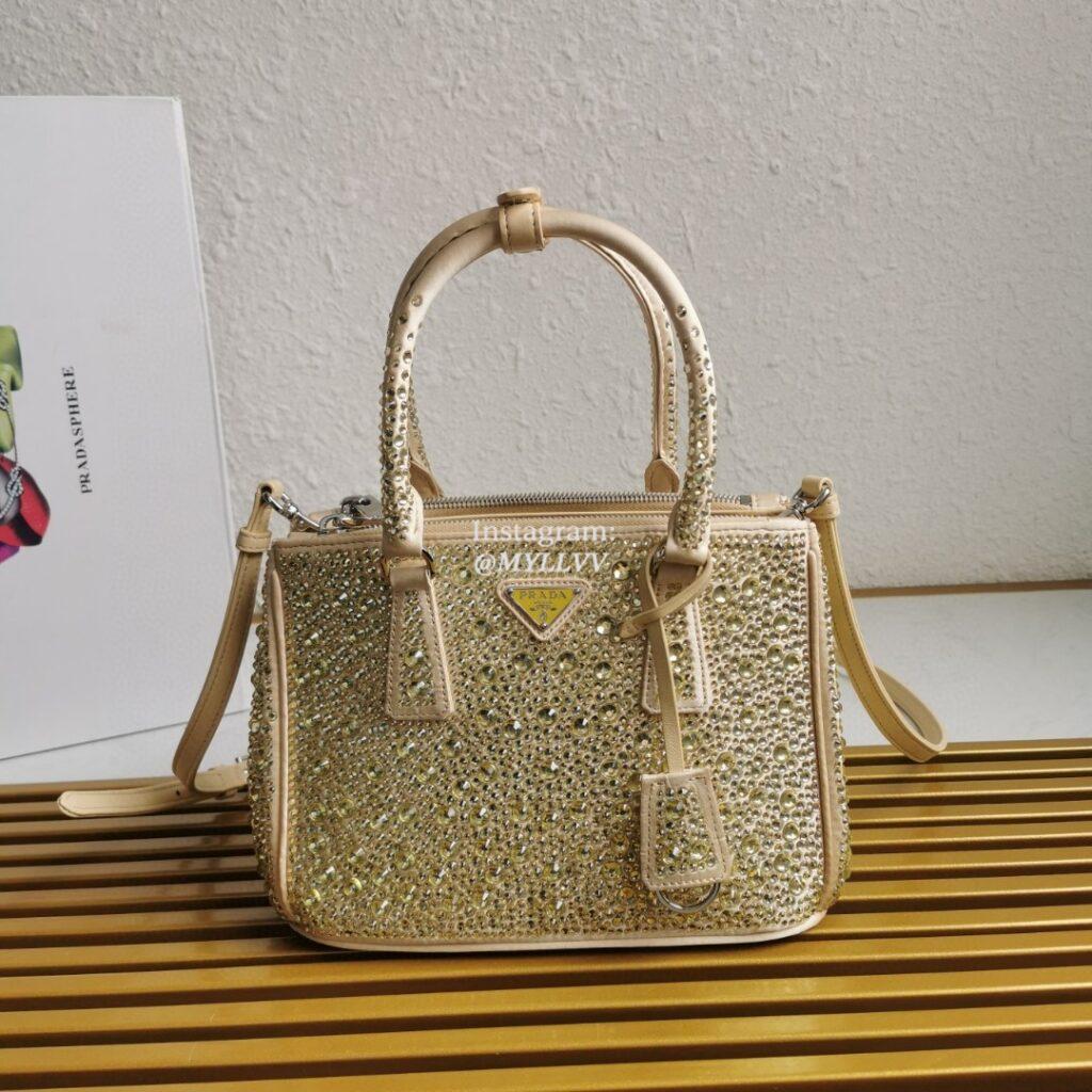 Top Quality Version:MYLLVV » Prada Apricot Small Satin Galleria Bag With Crystals 1BA896