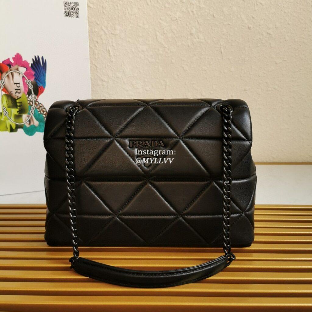 The Prada Spectrum bag is characterized by a geometric motif designed by the stitching on the nappa leather. It has a tonal metal lettering logo.