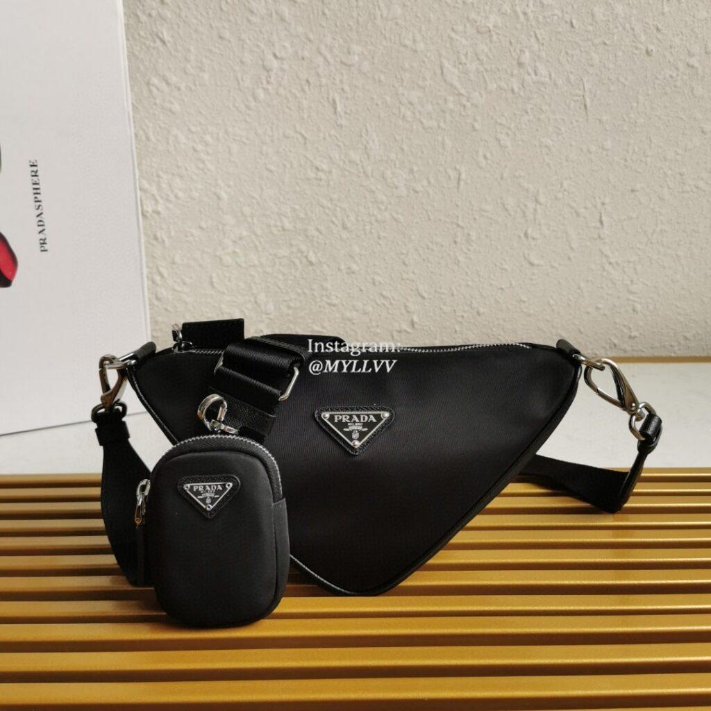 A study on the triangle inspires new geometric shapes and unique interpretations of Prada’s historical code. The iconic shape returns in this shoulder bag with sleek lines that comes with an adjustable shoulder strap for versatile wear. The enameled metal triangle logo enhances the minimalist aesthetic.