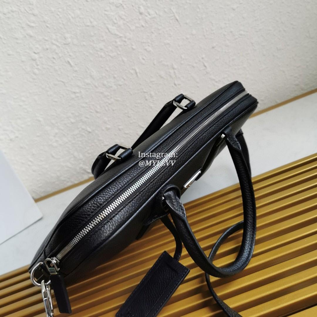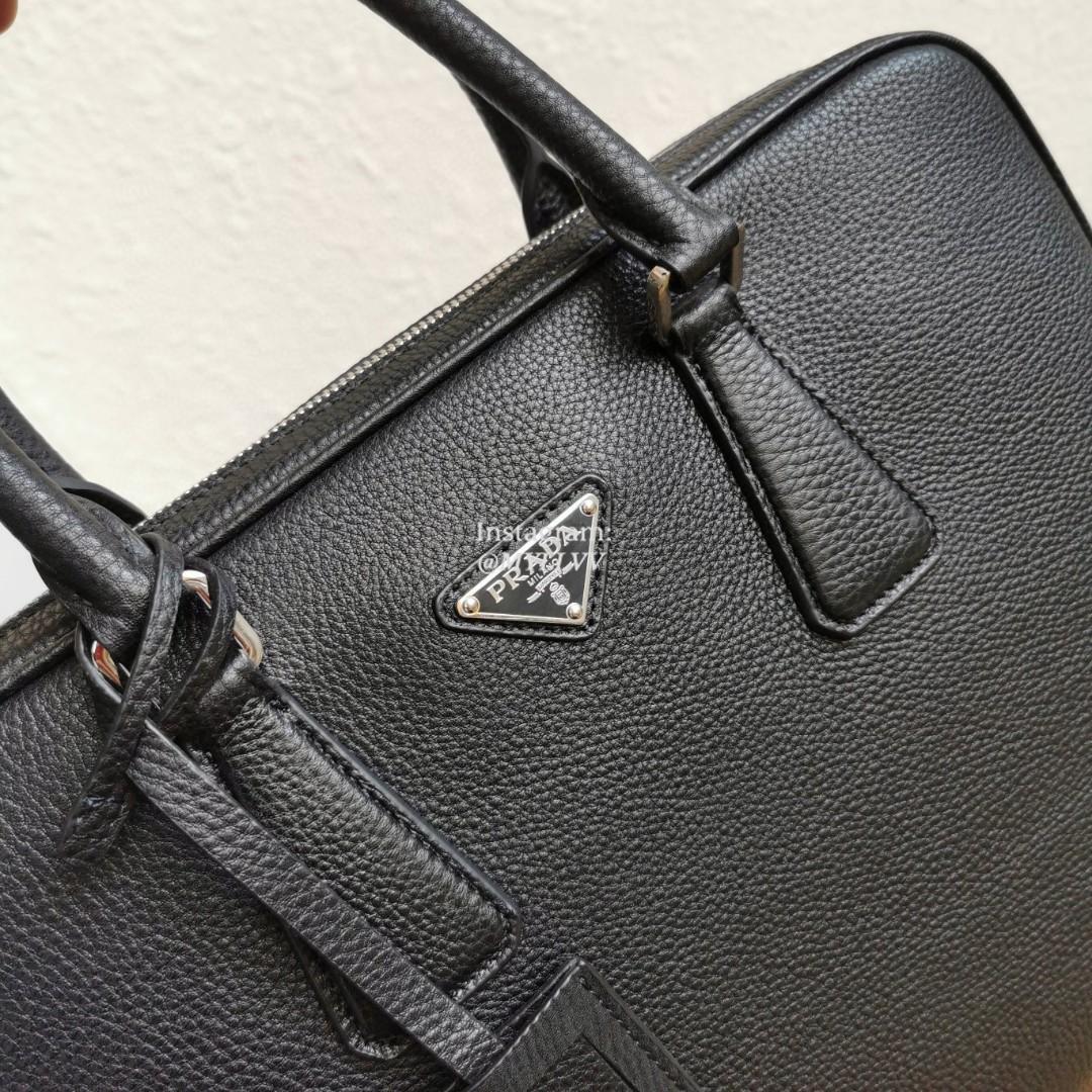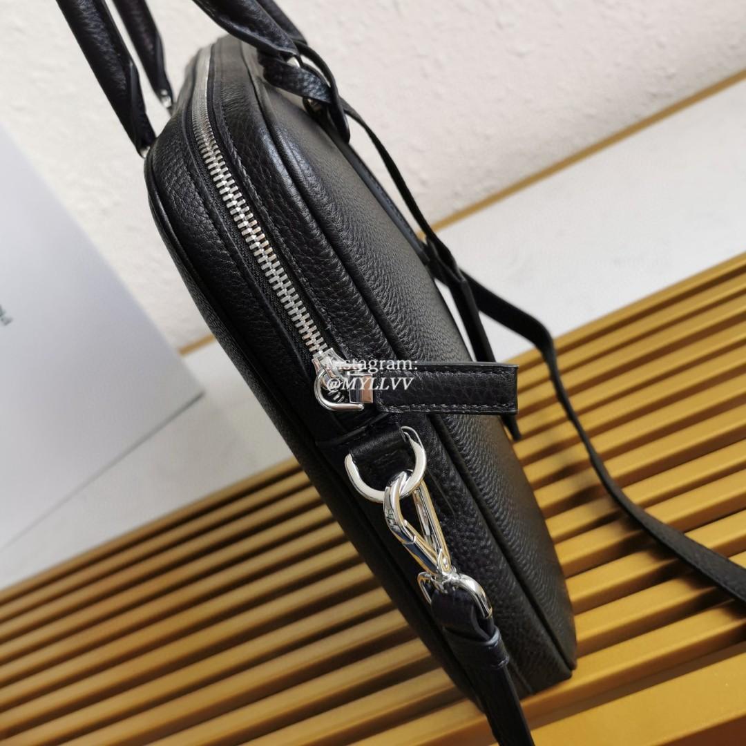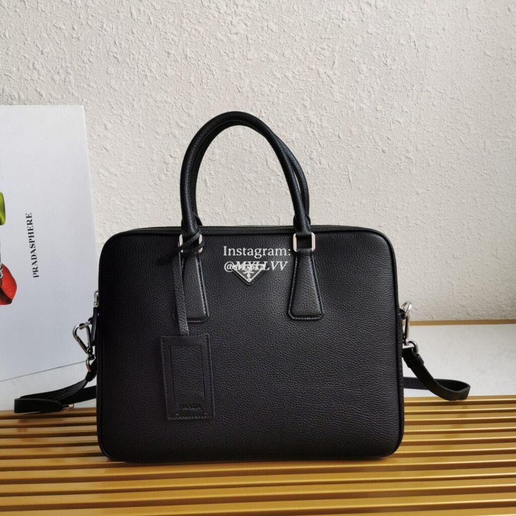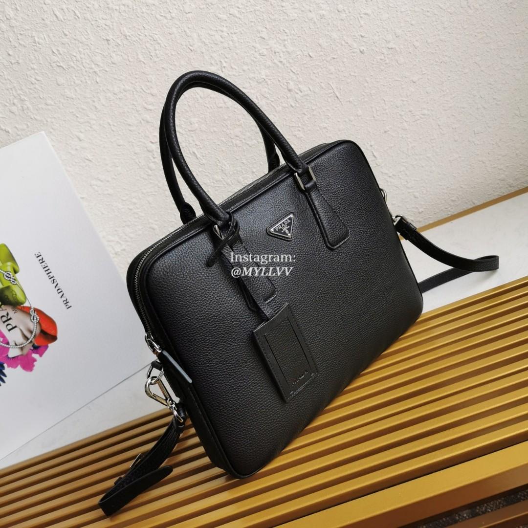 A curve-edged leather briefcase with metal Prada lettering. The case has two handles, a detachable shoulder strap and name tag. The inside has dedicated spaces for an iPad and two smartphones.