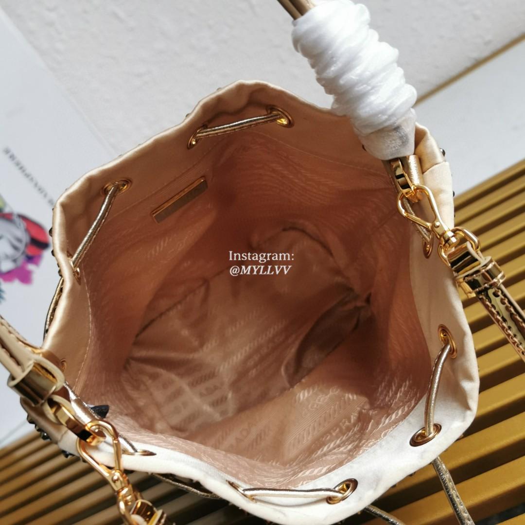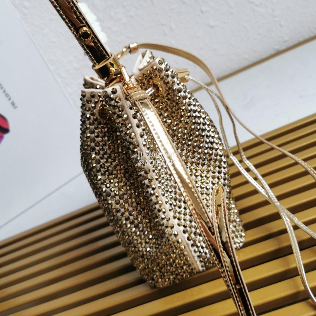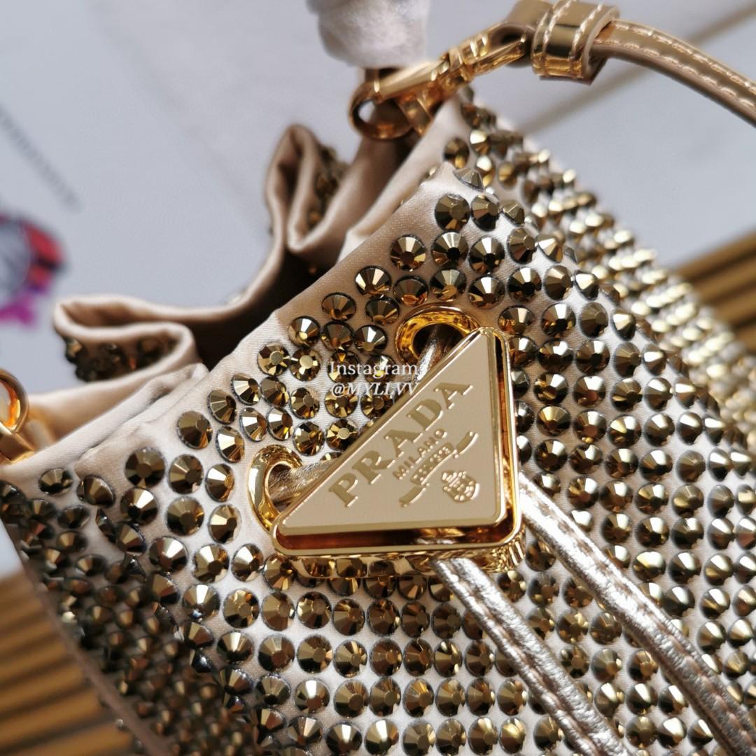 Dimension: 16.0 × 21.0 × 10.0 cm Top Quality Version:MYLLVV » Prada Gold Satin Mini-Bag With Crystals Handbag 1BE067