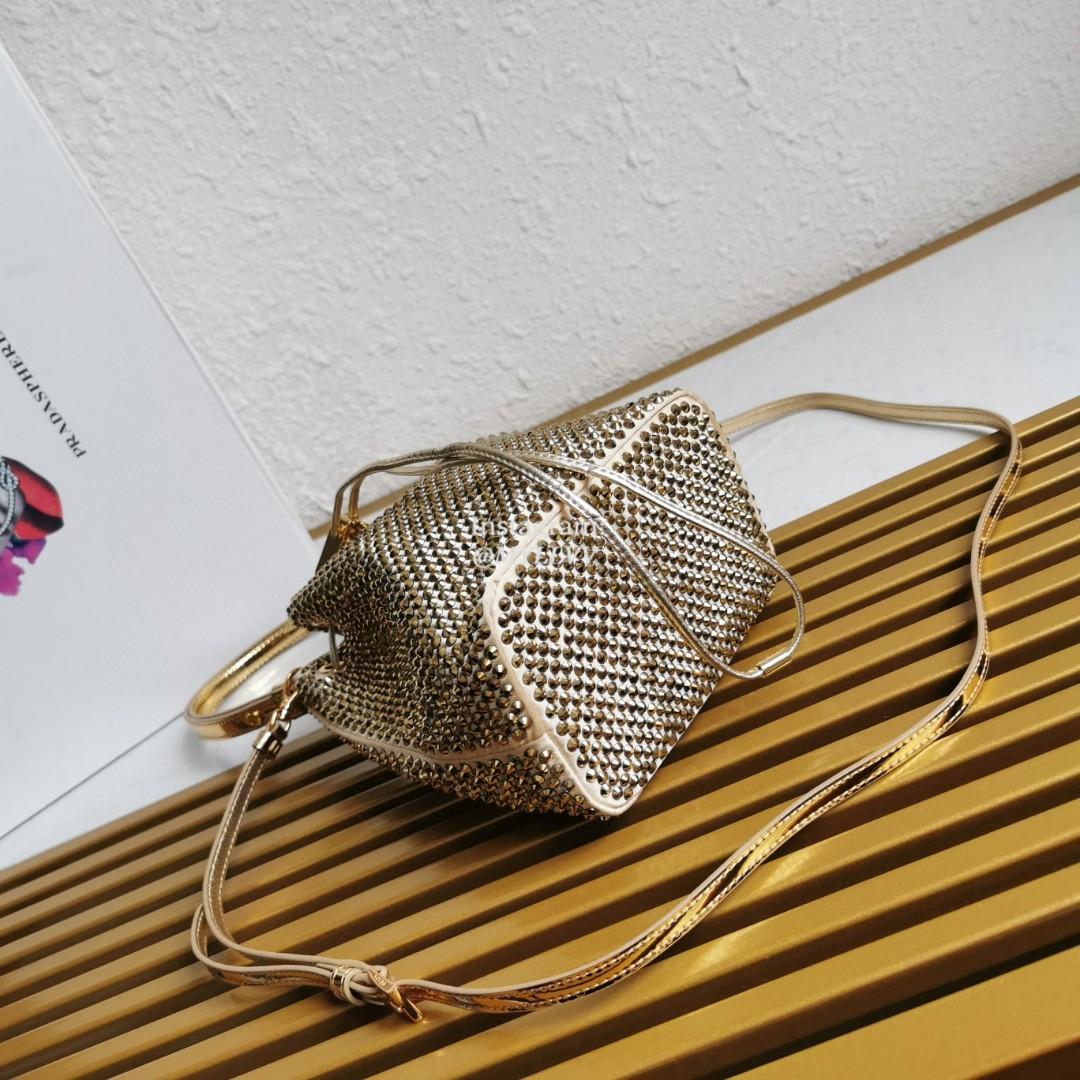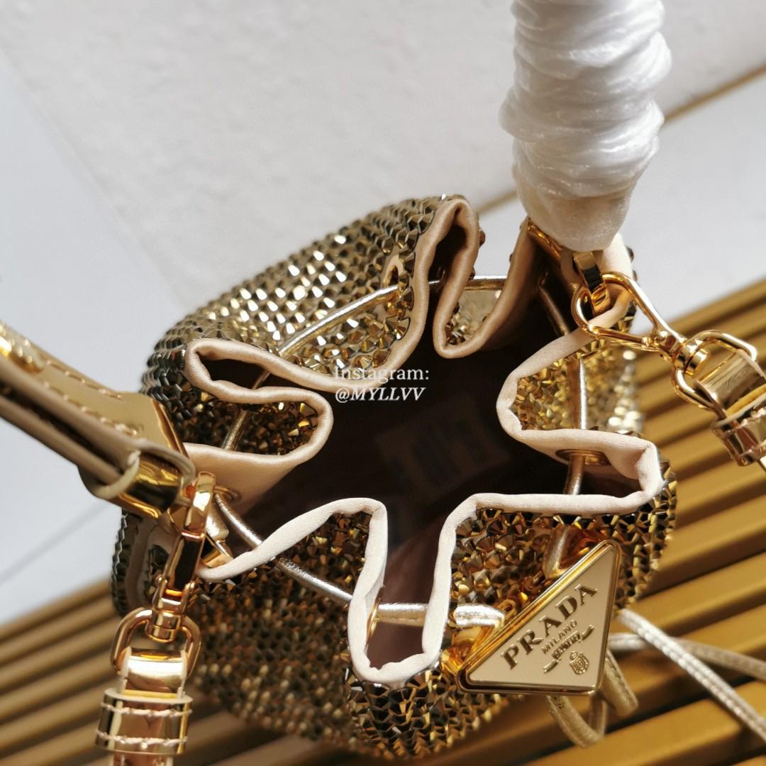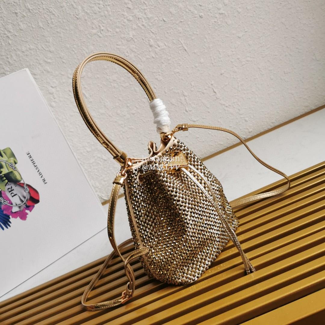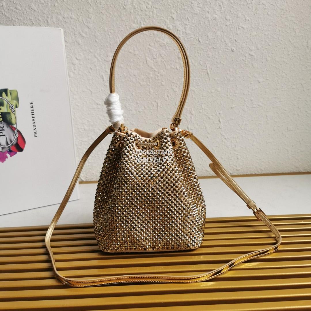 Dimension: 16.0 × 21.0 × 10.0 cm Top Quality Version:MYLLVV » Prada Gold Satin Mini-Bag With Crystals Handbag 1BE067