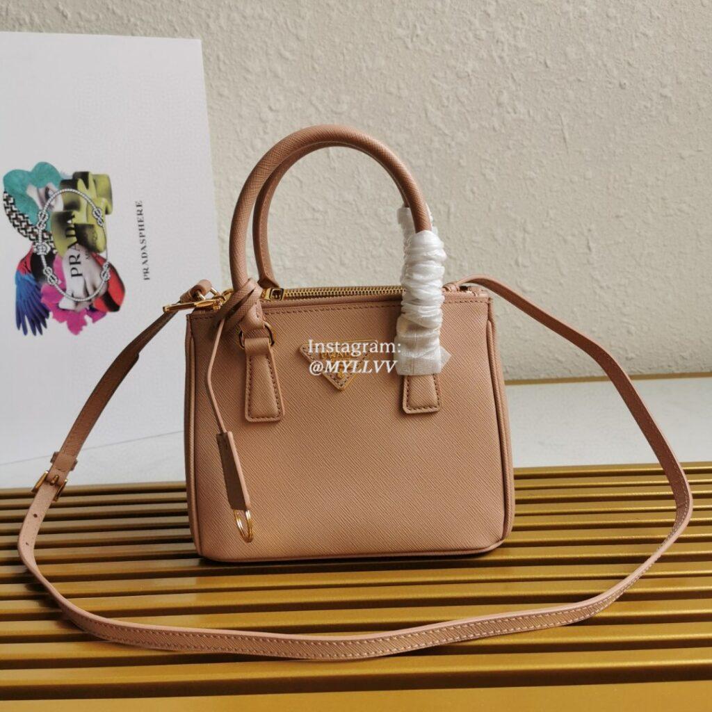 Production of the Prada Galleria bag, composed of 83 pieces, is an authentic fusion between industrial precision and the refined accuracy of craftsmanship that can only be performed by hand. The design is clean and elegant yet innately pragmatic, an aesthetic language blending form and function that combines history and modernity. Originating the definition of “timeless”, the Galleria bag has become a hallmark of Prada’s identity in the twenty-first century. The accessory, presented in the mini version, is made of iconic Saffiano leather that was patented by the founder of the brand and features a crosshatch texture and waxed finish.