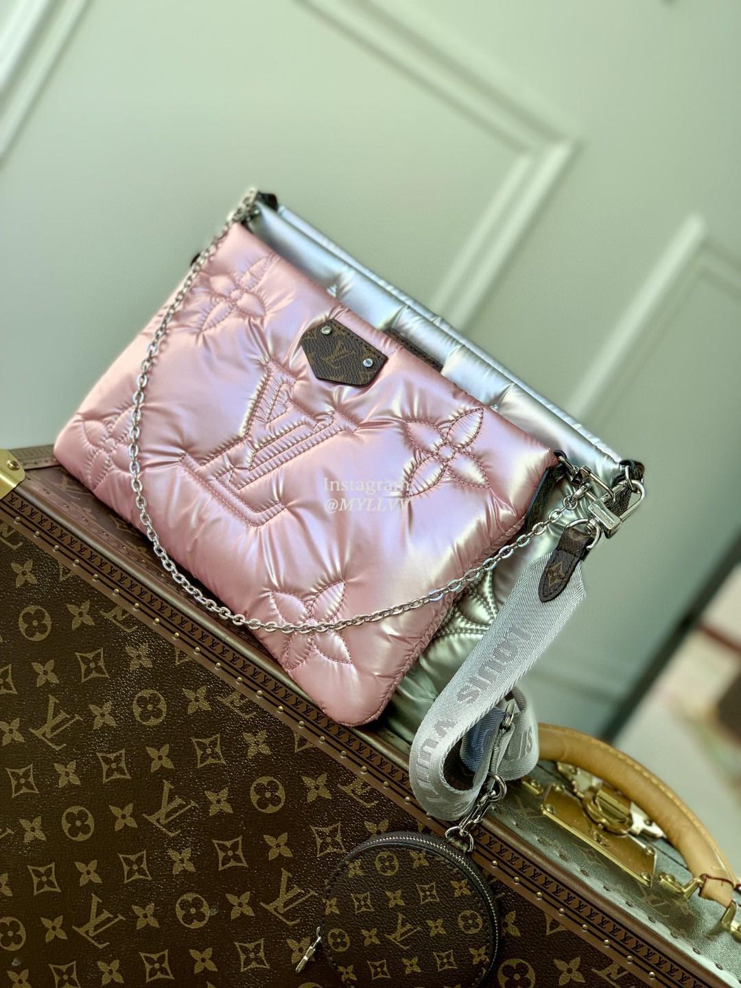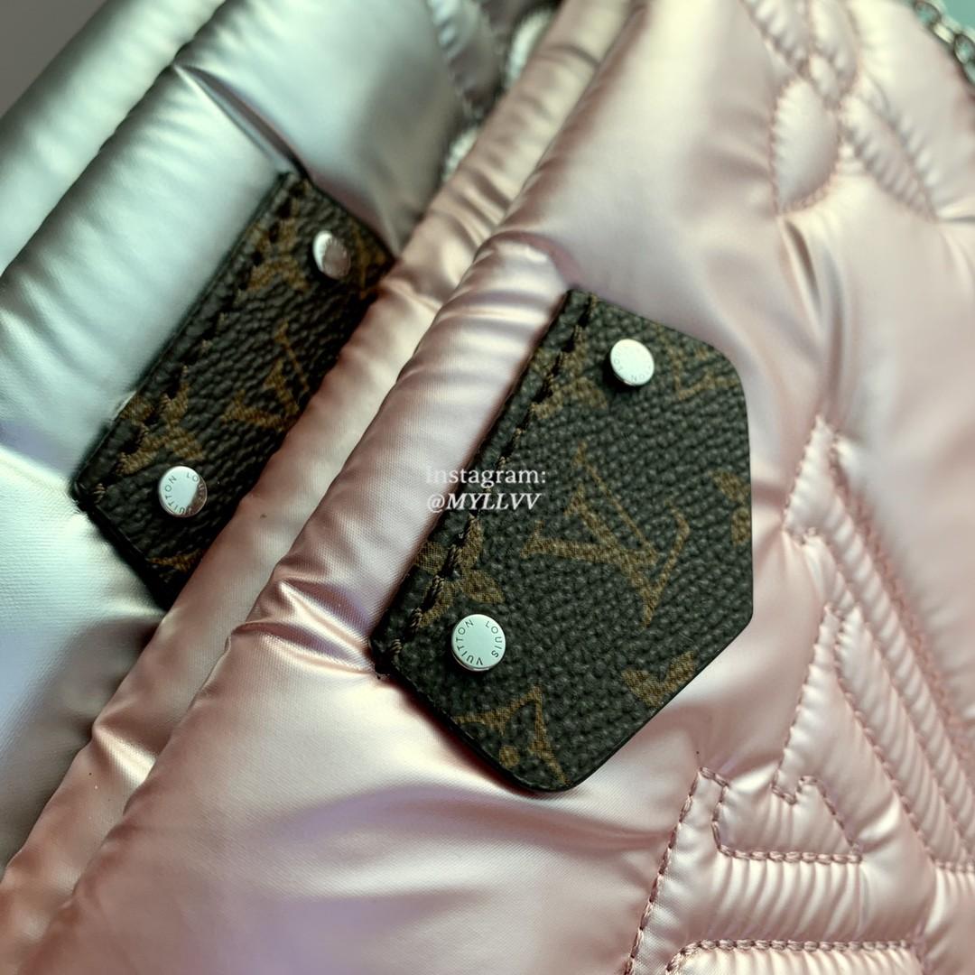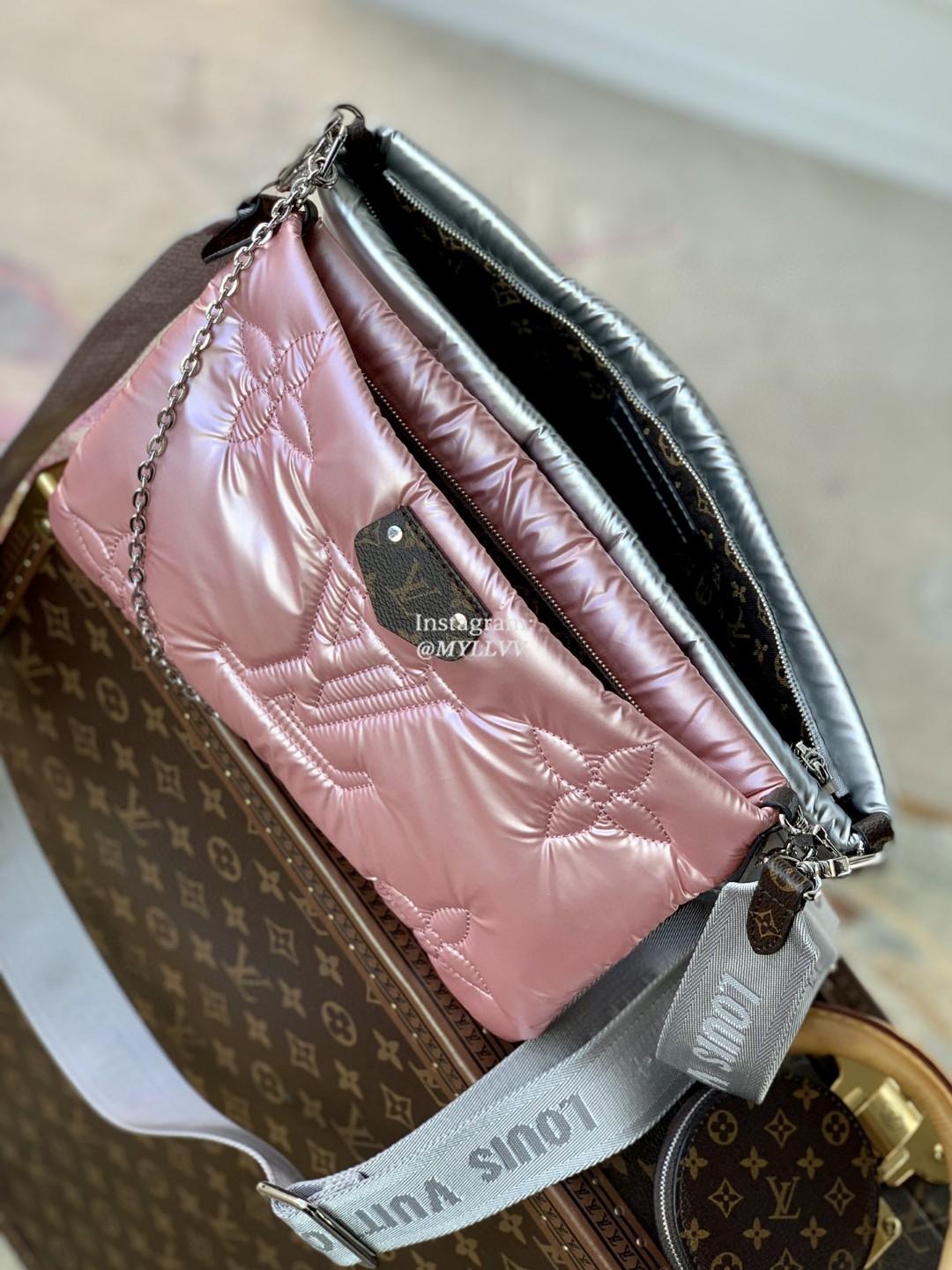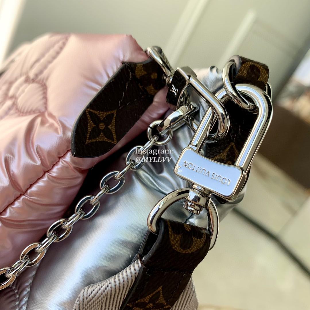 Crafted from recycled nylon in pale pink and silver, the Maxi Multi-Pochette Accessoires belongs to the season’s LV Pillow capsule. This playful piece provides so many styling opportunities: it can be worn cross-body on the long removable strap, carried as a clutch or by hand on its removable chain, with or without the cute detachable coin purse.