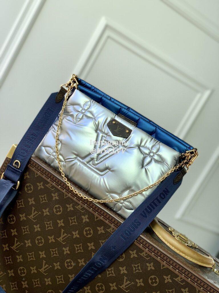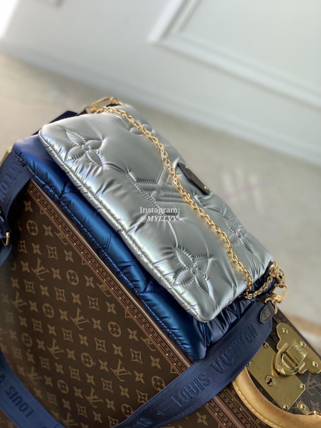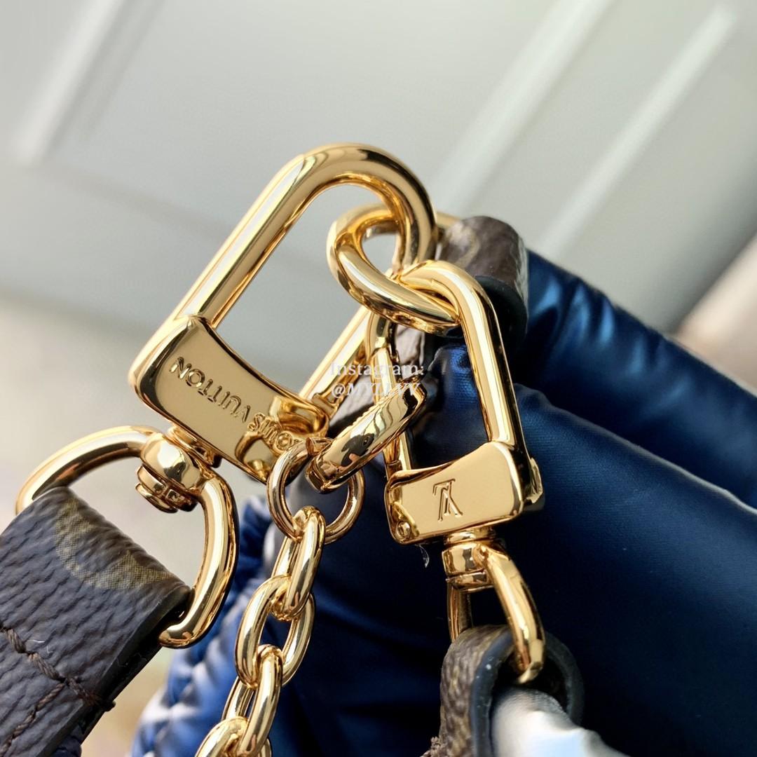 Crafted from recycled nylon in navy-blue and silver, the Maxi Multi-Pochette Accessoires belongs to the season’s LV Pillow capsule. This playful piece provides so many styling opportunities: it can be worn cross-body on the long removable strap, carried as a clutch or by hand on its removable chain, with or without the cute detachable coin purse.