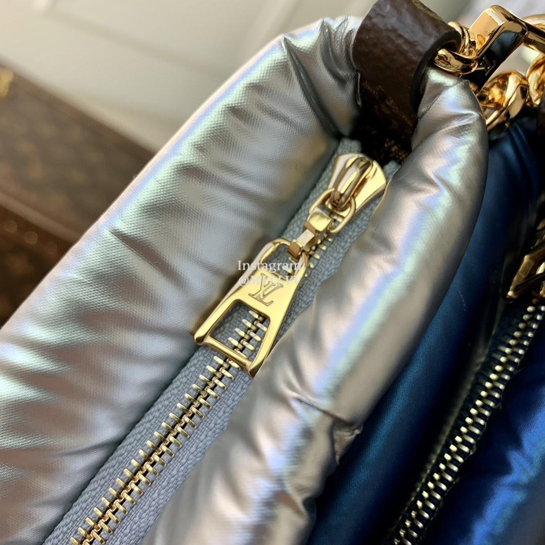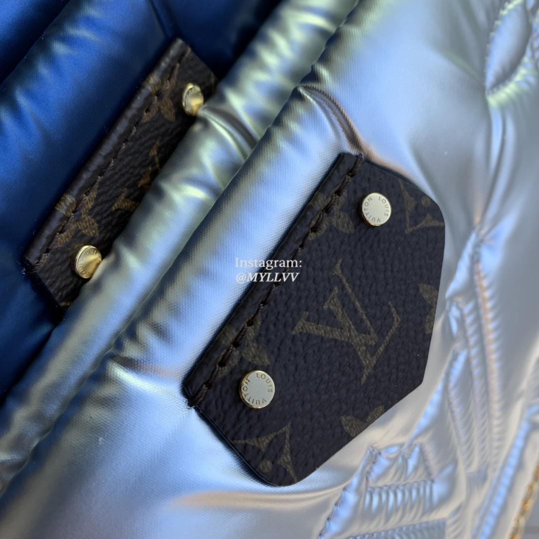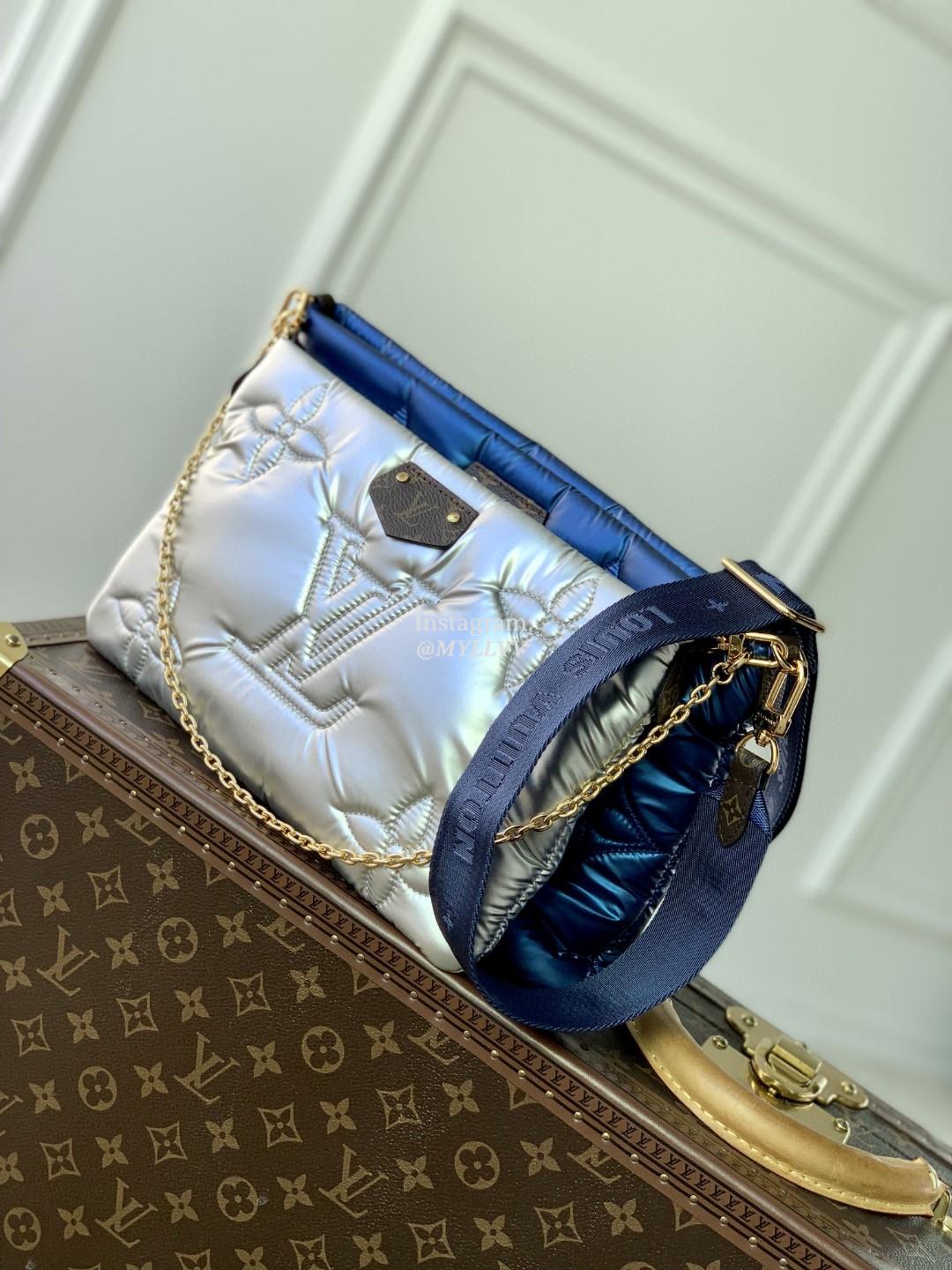 Crafted from recycled nylon in navy-blue and silver, the Maxi Multi-Pochette Accessoires belongs to the season’s LV Pillow capsule. This playful piece provides so many styling opportunities: it can be worn cross-body on the long removable strap, carried as a clutch or by hand on its removable chain, with or without the cute detachable coin purse.