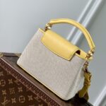 This summery edition of the Capucines BB handbag is crafted from natural ecru canvas with a top handle and trim in pastel-yellow Taurillon l...