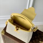 This summery edition of the Capucines BB handbag is crafted from natural ecru canvas with a top handle and trim in pastel-yellow Taurillon l...